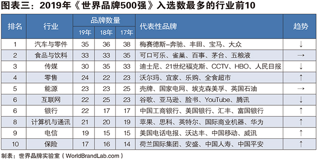今年《世界品牌500强》共覆盖了54个行业。其中,汽车与零件行业共有35个品牌入榜,排名继续保持第一;食品与饮料行业今年有33个品牌上榜,超越传媒行业排名第二;传媒行业受到纸质媒体不景气的影响,相比去年减少了5个,今年共有30个品牌上榜,排名第三。其他入选数量排名靠前的行业有零售行业(24个)和能源行业(23个),分别位列第四和第五,互联网和银行业各有22个入榜,并列第六。