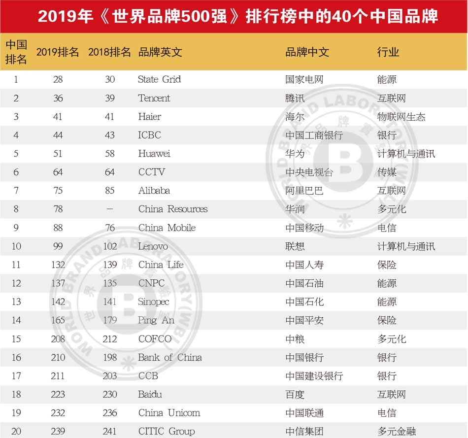 中国有40个品牌入选,入选品牌数量位列世界第5名。其中表现亮眼的品牌有国家电网、腾讯、中国人寿、华润、长虹、青岛啤酒、中化、五粮液、国航、中国航天科工、恒力、中国光大集团、徐工。