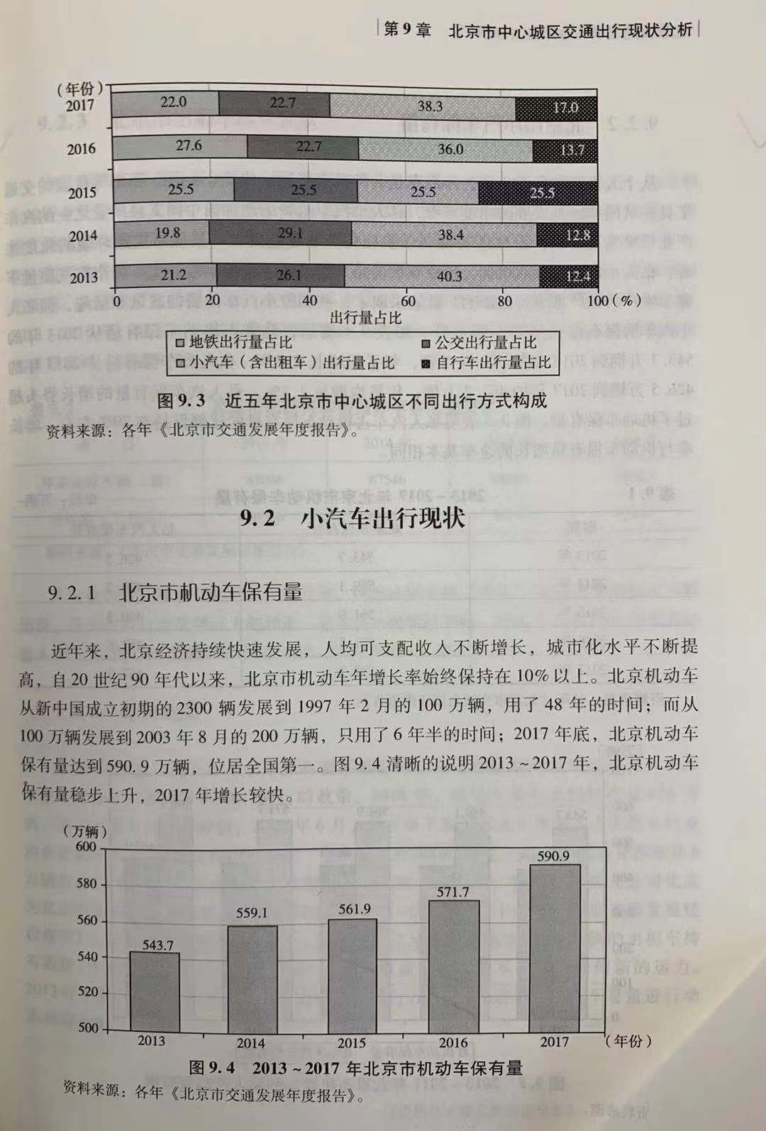 报告分析,2017年,北京市中心城区日出行量为2765万人次(不含步行),较上年有所增长。2017年,本市中心城区绿色出行比例为61.7%,其中轨道交通占22%,地面交通占22.7%,自行车占17%;另外,小汽车(含出租车)占38.3%。从2013年到2017年的五年间,公共交通一直占主导地位,但小汽车出行占比也不低。