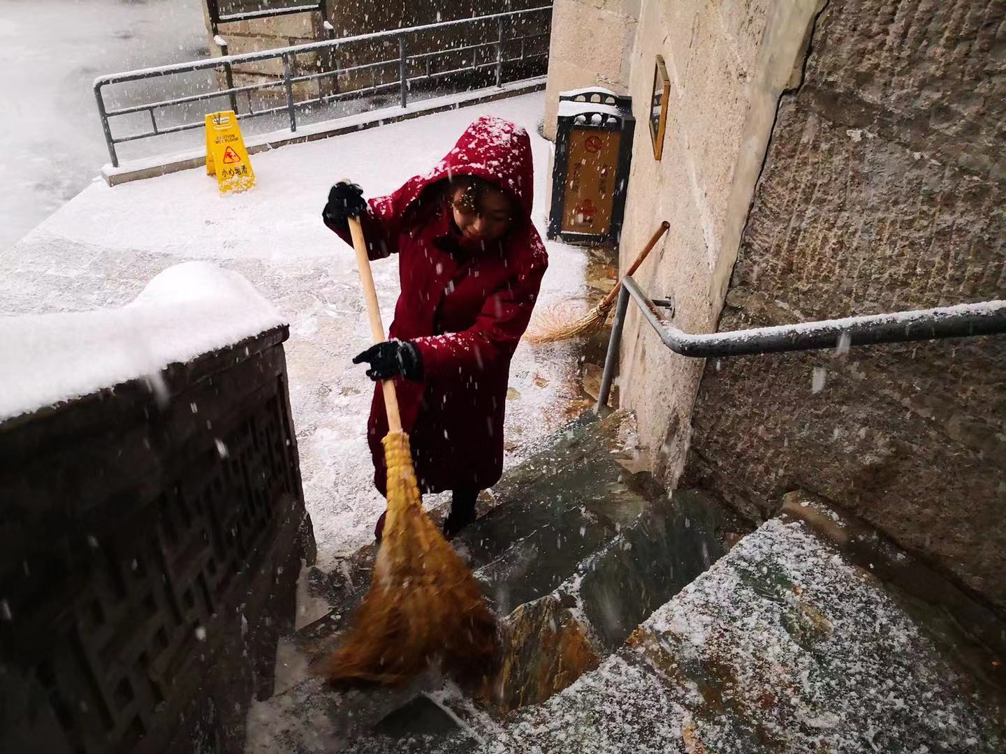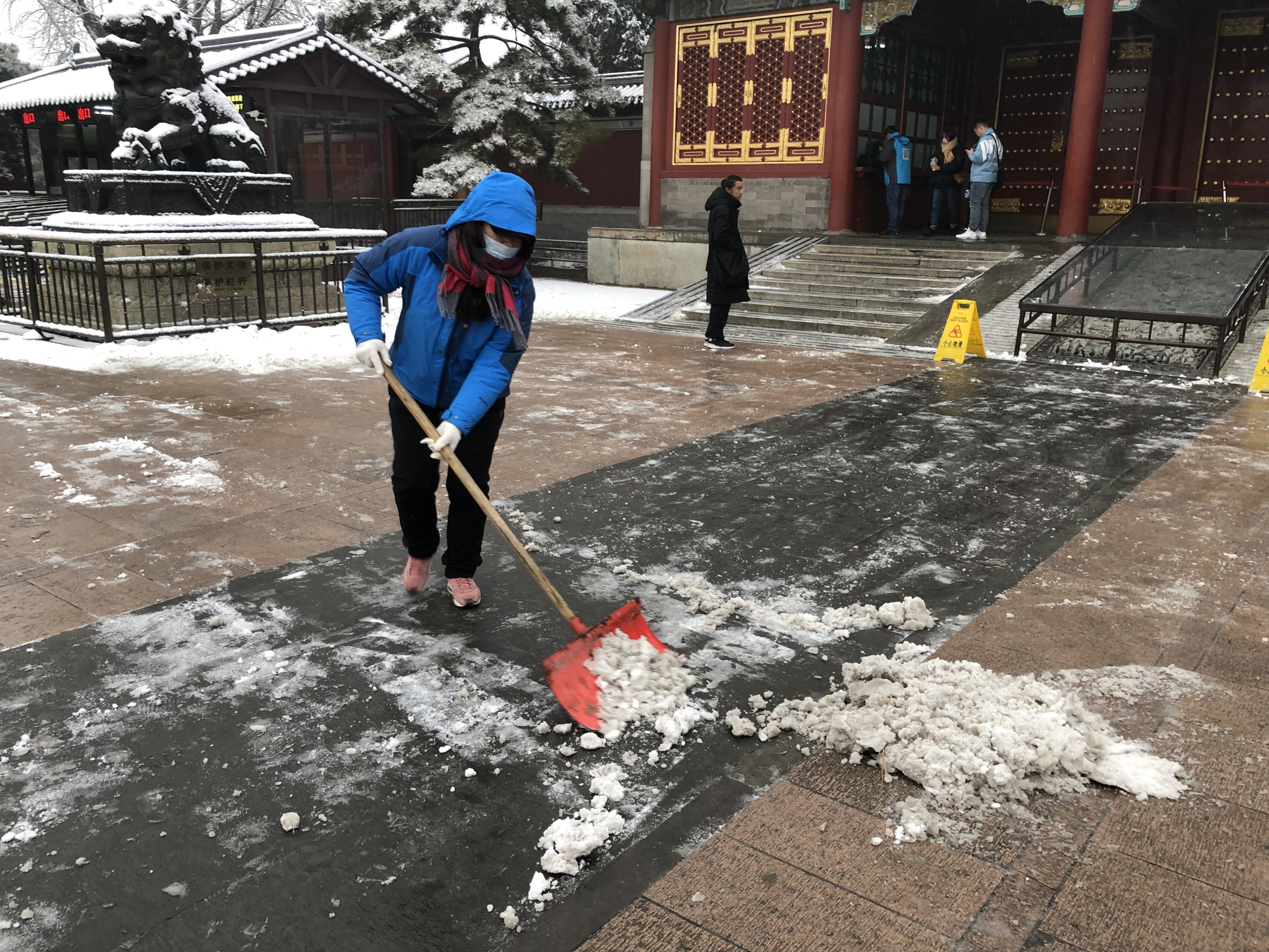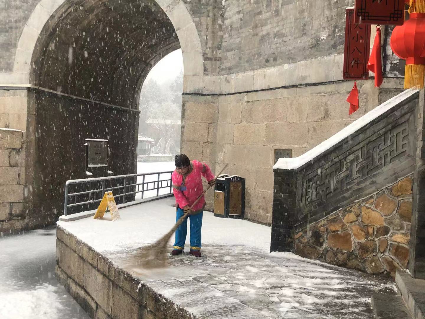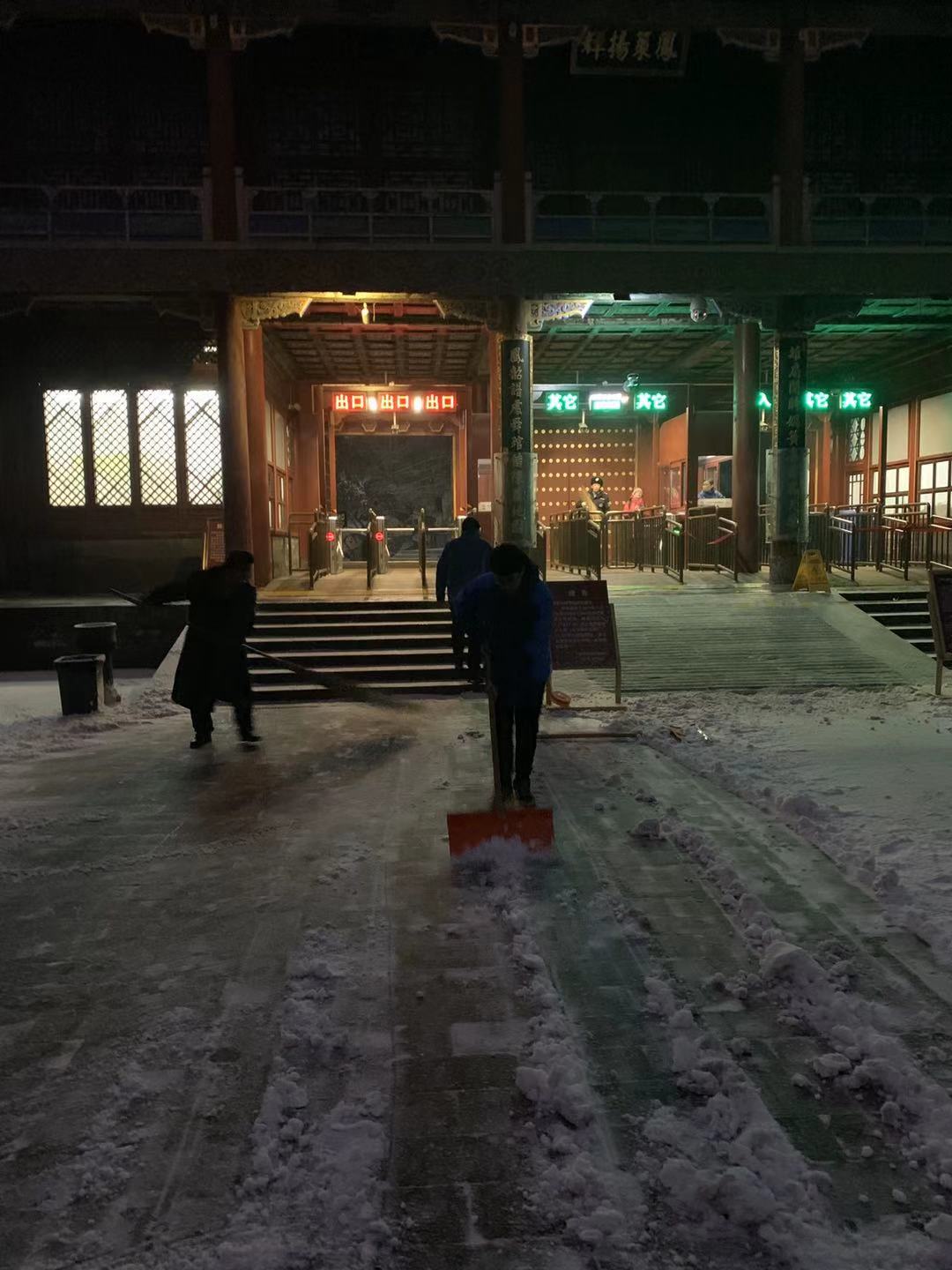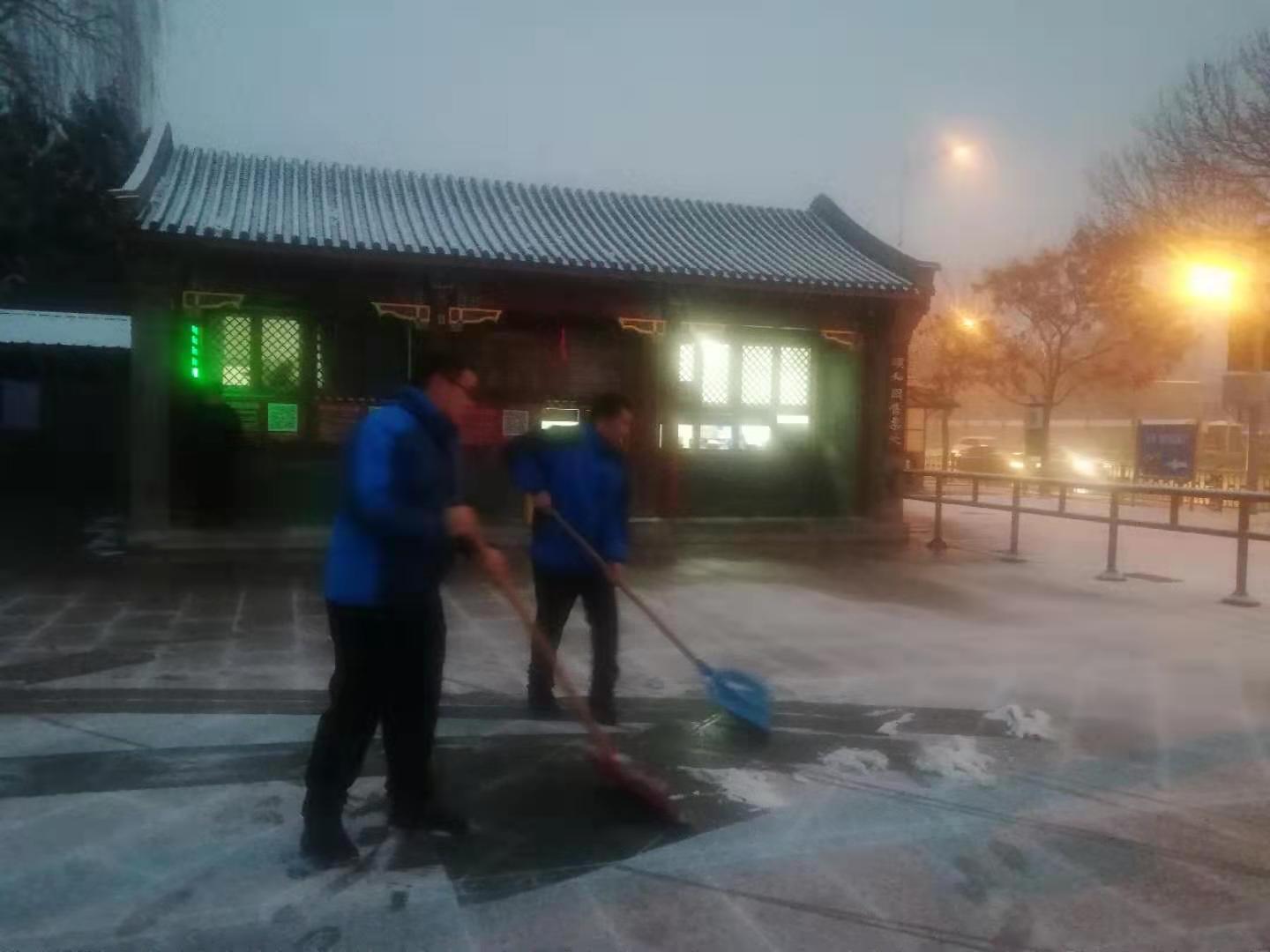 漫天飞舞的雪花,满足了人们的期待,却也给游园安全保障带来了极大的考验。颐和园的职工们早在天蒙蒙亮,就奋战在院内的各个角落。