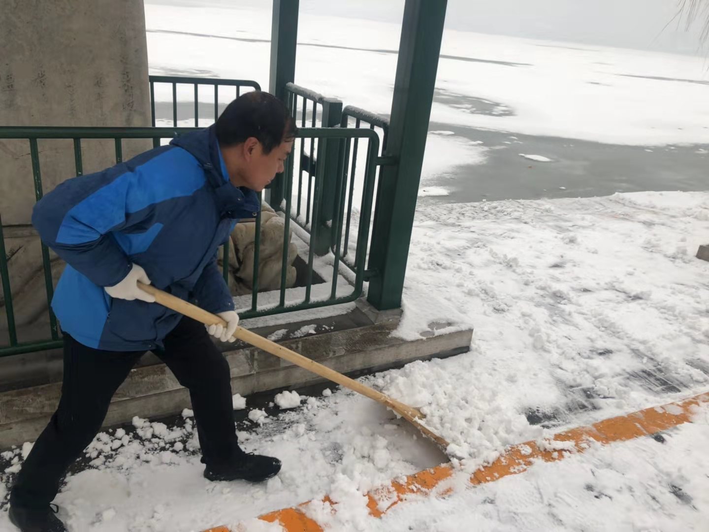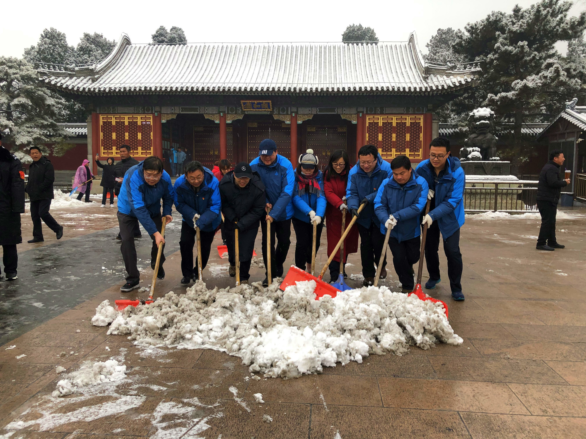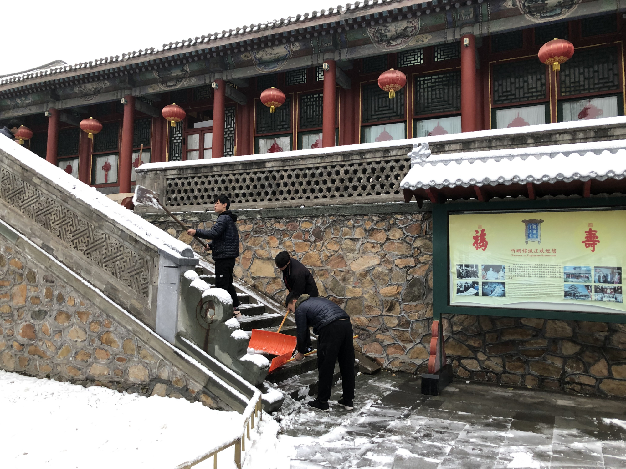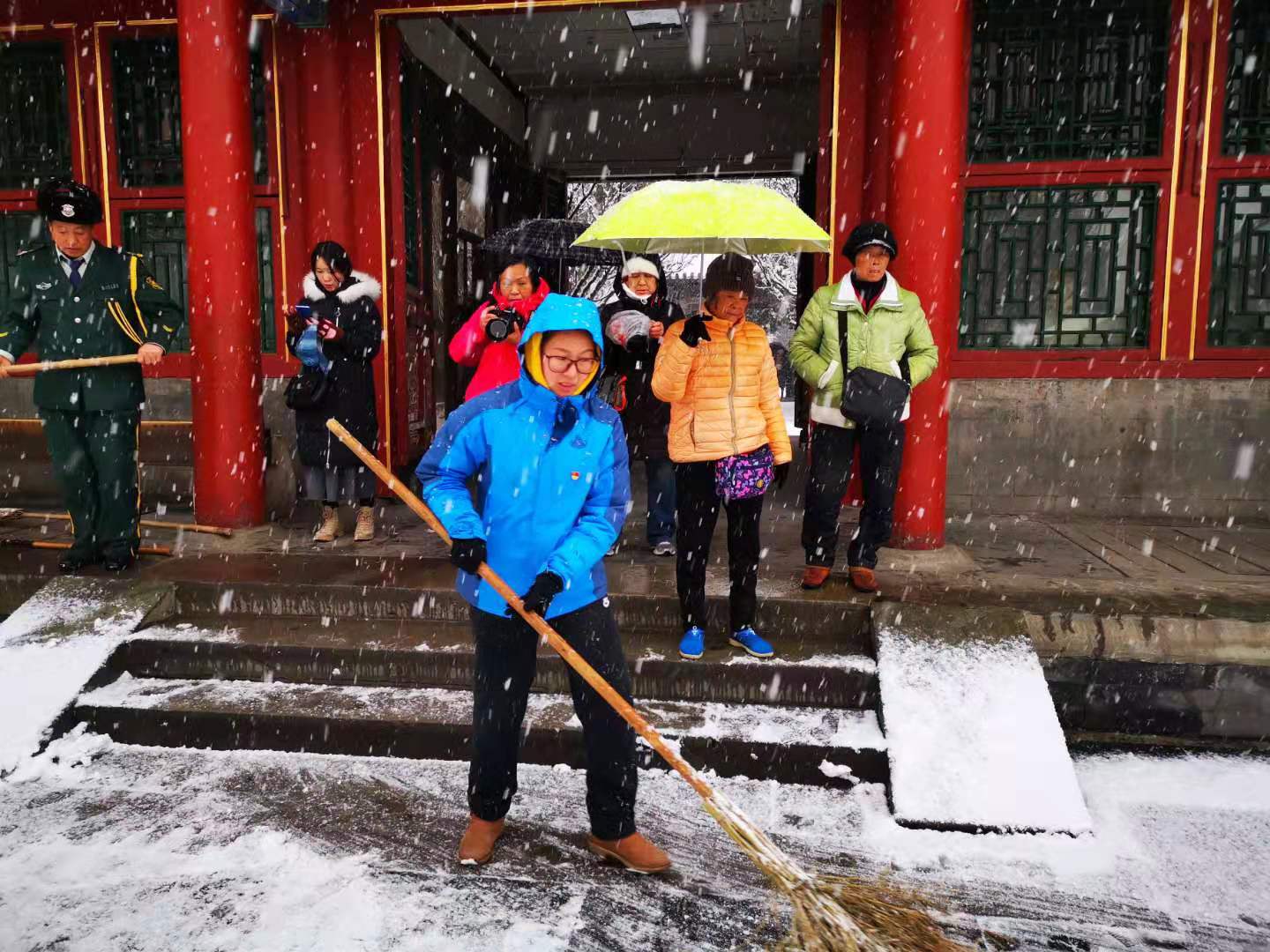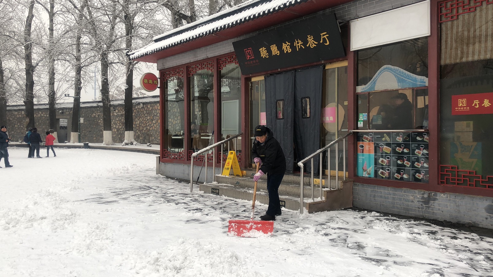 漫天飞舞的雪花,满足了人们的期待,却也给游园安全保障带来了极大的考验。颐和园的职工们早在天蒙蒙亮,就奋战在院内的各个角落。