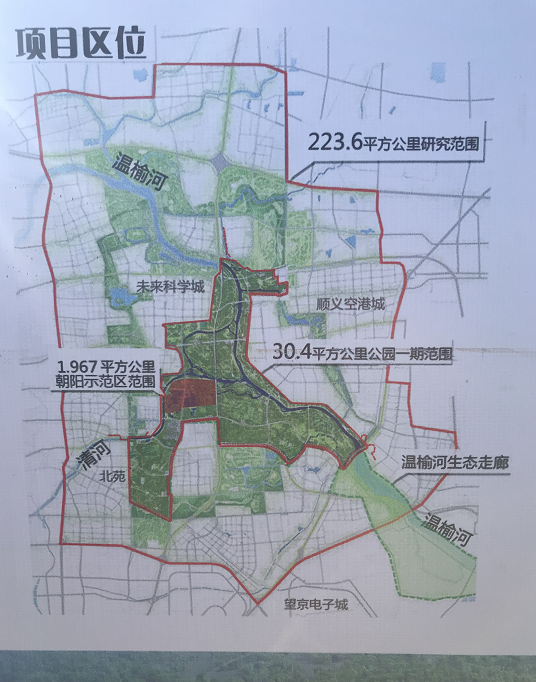 公园一期起步区项目位于温榆河公园休憩开放区中部,处于朝阳区西北角,实施面积为1.967平方公里,北至西至清河滨河路,南至黄港南路,东至京承高速。