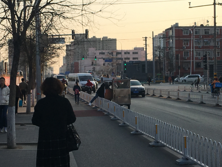 一路上,摩的始终沿着南苑路辅路逆行向北,与旁边正常行驶的机动车和自行车互相交错。行至天雅商场附近时,辅路的机动车道与非机动车道之间架起了护栏,原本压着分界线行驶的摩的只能拐进非机动车道,并占据了车道的大部分空间,只给正常行驶的自行车留了条小通道。