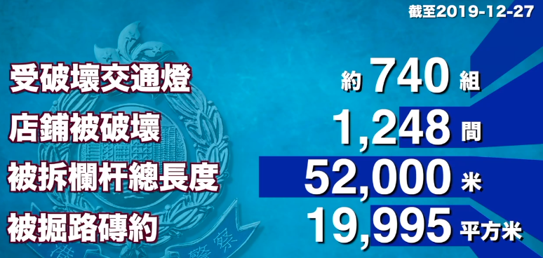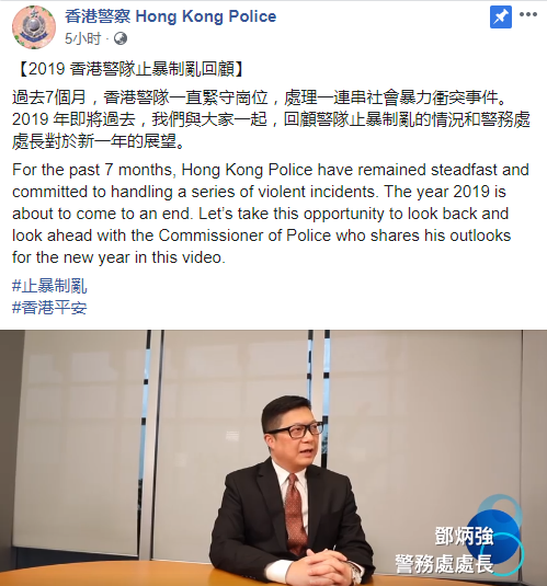 12月30日,香港警方在社交平台上发布了专题片《2019止暴制乱回顾》。警队“一哥”邓炳强对修例风波感叹道,相信市民对过去半年多的暴力活动已经厌恶,并称警方会尽一切办法“拉人”(粤语,拘捕犯法者)。据警方公布的数字显示,截至本月27日,“修例风波”期间共有6494人被捕,其中2591人是学生;涉暴动罪、非法集结者分别有1406人、3070人,整体被控人数多达1023人。