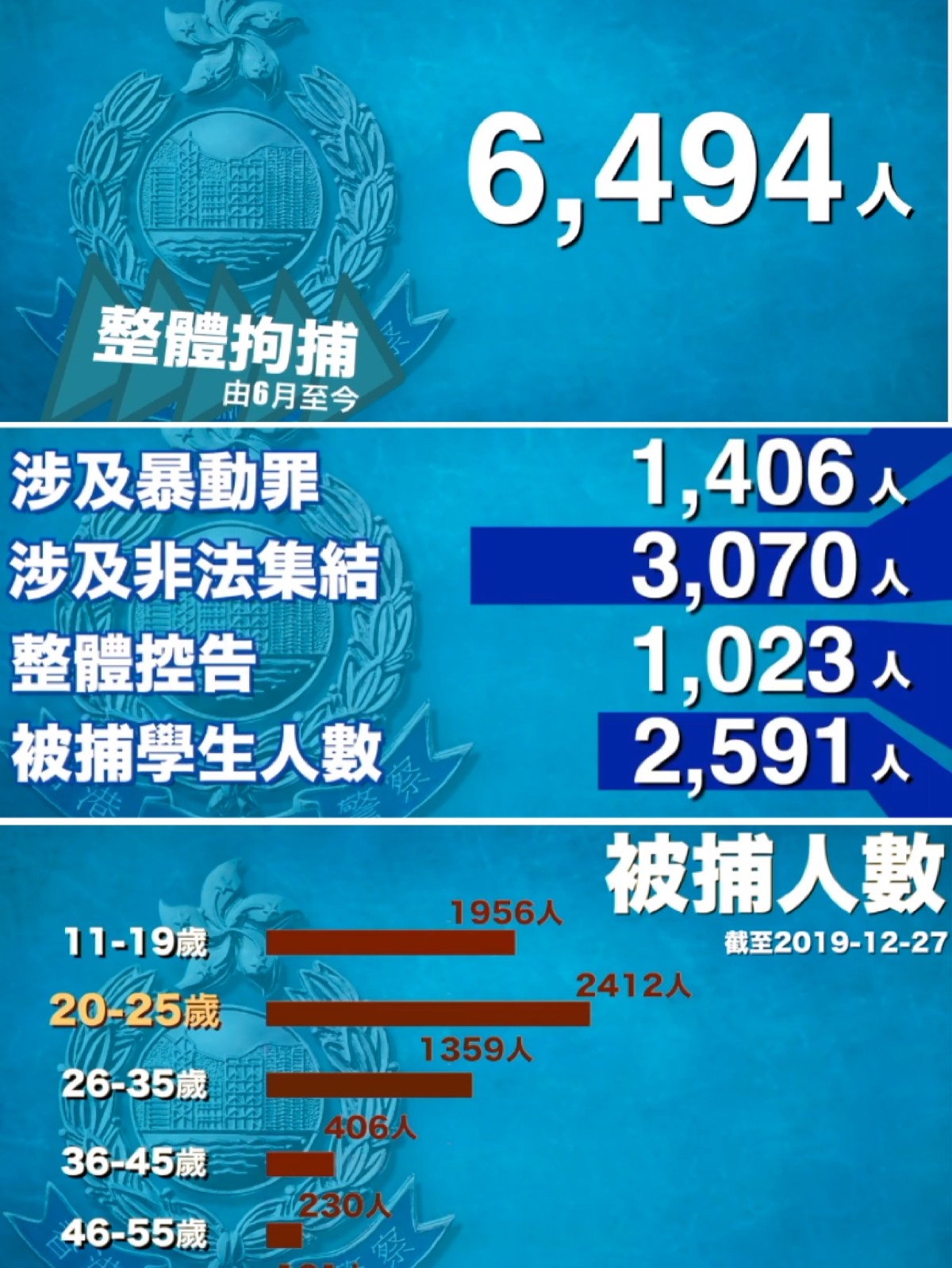 据警方公布数字显示,从6月至12月27日共拘捕6494人,其中1956人介乎11至19岁、2412人介乎20至25岁、1765人介乎26至35岁、406人介乎36至45岁、361人在46岁以上。被捕人士中有2,591人为学生,涉暴动罪、非法集结者分别为1406人、3070人,整体控告人数多达1023人。警方透露,在暑假期间,学生占总被捕人数的25%,开学后则大幅上升至40%。