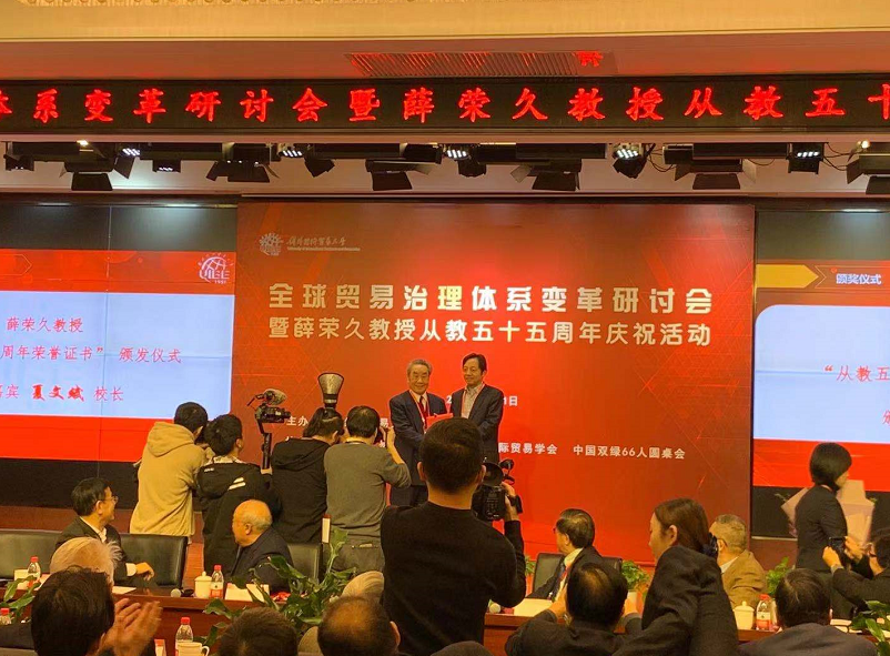 当天,学校为薛荣久教授颁发“从教五十五周年荣誉证书”,以他名字命名的教育基金也正式启动,首批捐赠资金55万元,捐赠者为“薛荣久老师的学生们”。