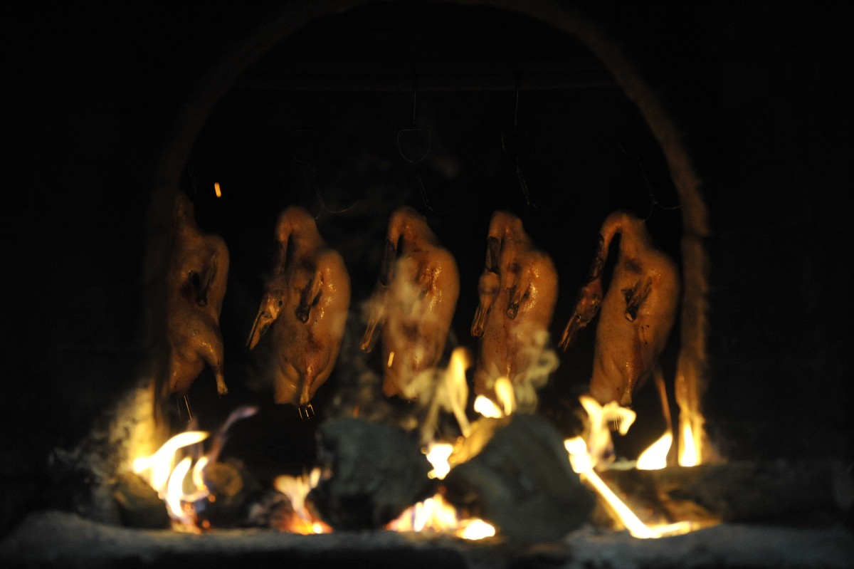 北京全聚德三元桥店里的挂炉烤鸭(2011年10月14日摄)。新华社图