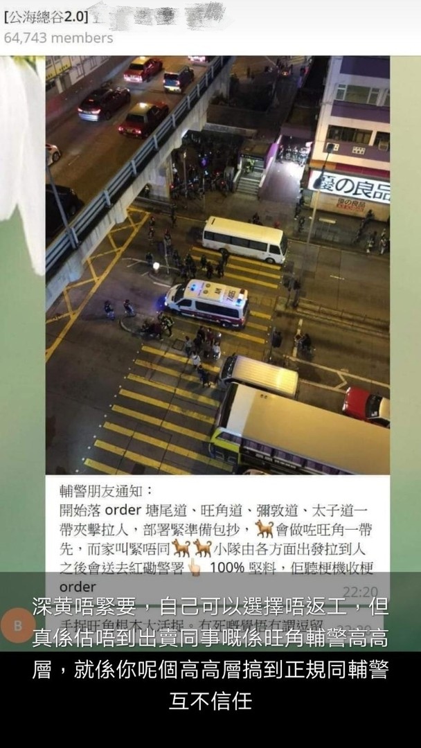 除夕当天正逢所谓“港铁太子站831事件”4个月,有极端分子在该站外聚集闹事。网上群组“公海”流传的一张警方行动照片显示了警员和警车的位置,有人在网上声称是“辅警朋友消息”,并指警方在旺角多条马路部署警力展开“包抄”拘捕行动,将被捕人士送往红磡警署。