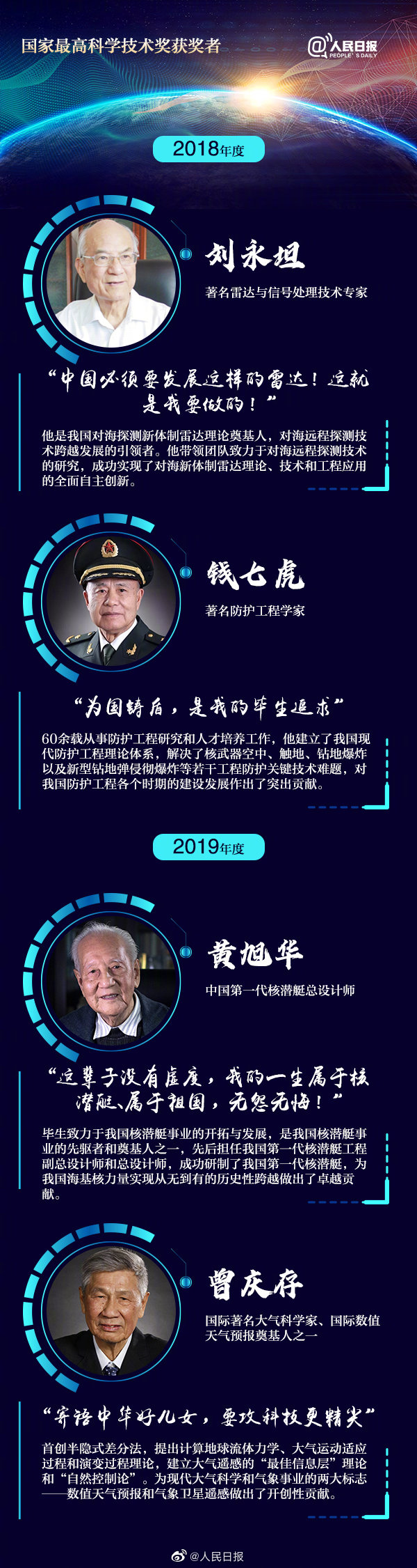 今天,2019年度国家科学技术奖励大会举行。黄旭华曾庆存获国家最高科技奖 。国家最高科技奖的颁发是科技界的盛事,每年获奖者不超过2名。自设立至今,共有33位科学家获奖。历届国家最高科学技术奖获奖者全名单