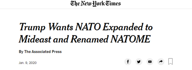 特朗普甚至建议给这个有着70年历史的国际组织起一个新名字:“NATOME”,即“NATO-Middle East”的缩写。