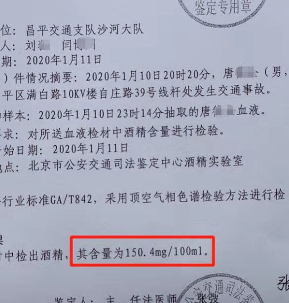 昌平交通支队沙河大队路面巡逻民警赶到现场后,立即将54岁的肇事司机唐某控制,经对他进行呼气式酒精检测,此人每百毫升血液酒精含量为176毫克,已超过80毫克的醉酒驾车标准。