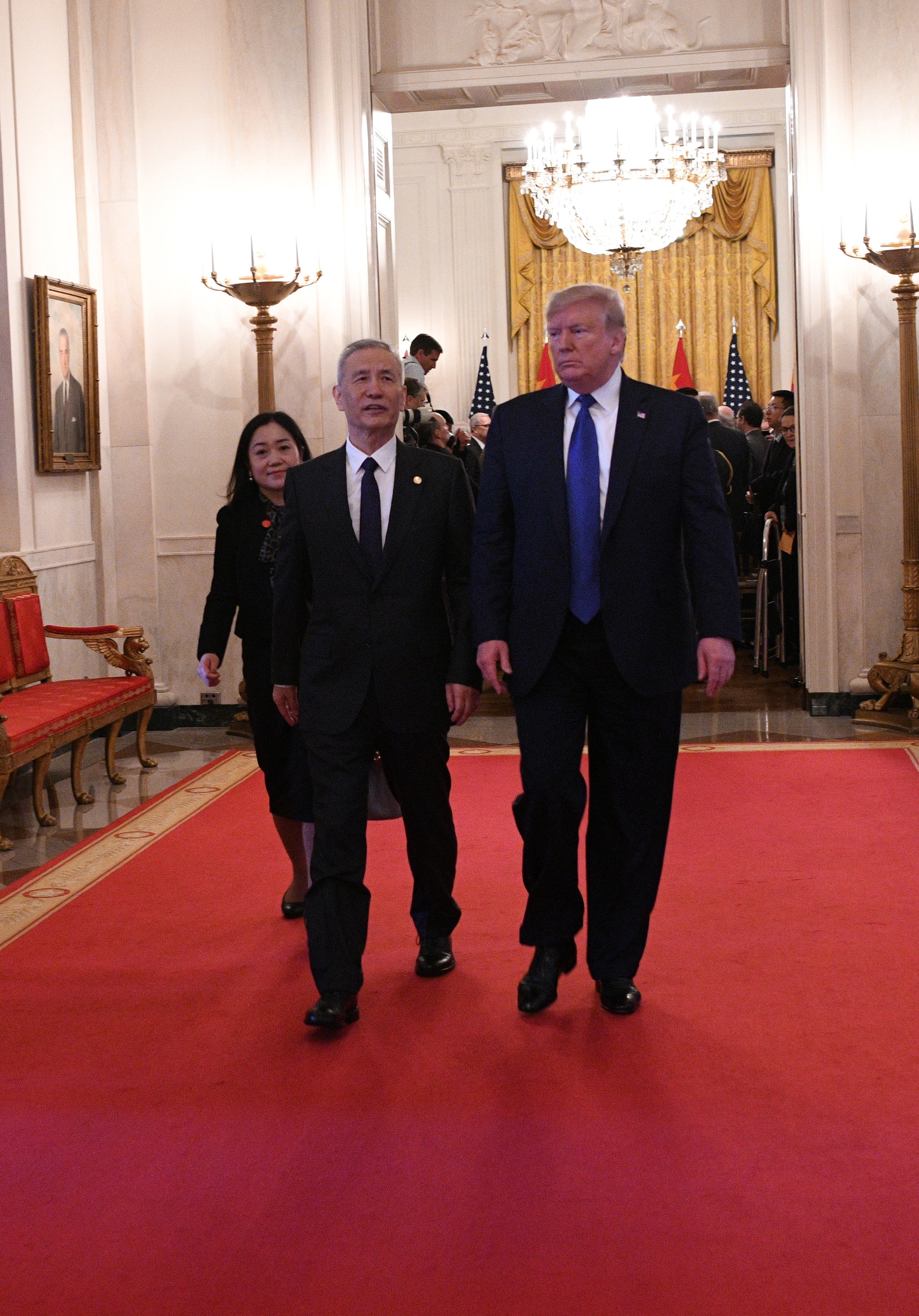 ↑ 1月15日,刘鹤与特朗普抵达华盛顿白宫东厅,准备参加中美第一阶段经贸协议签署仪式。 新华社记者 王迎 摄