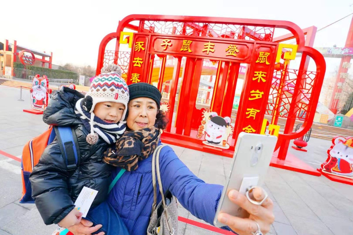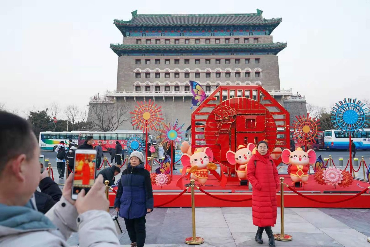 为了增添喜庆的年味,各类装饰大多选用吉祥年画、传统纹样等民俗文化符号,同时设计了风车、爆竹、葫芦等传统布置造型。爆竹是辞旧迎新的标志,有着兴隆繁盛、平安喜乐的寓意,阜内大街上悬挂的灯饰就结合了爆竹元素,定名为“爆竹声声贺新春”。再过几天就是农历鼠年了额,在前门大街,在步行街北口设置“金鼠纳福”景观小品。
