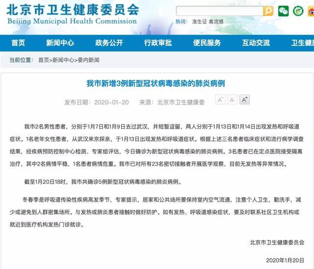 1月20日晚,北京市卫健委宣布,北京有3名患者(2男1女)确诊为新型冠状病毒感染的肺炎病例,正在定点医院接受隔离治疗。