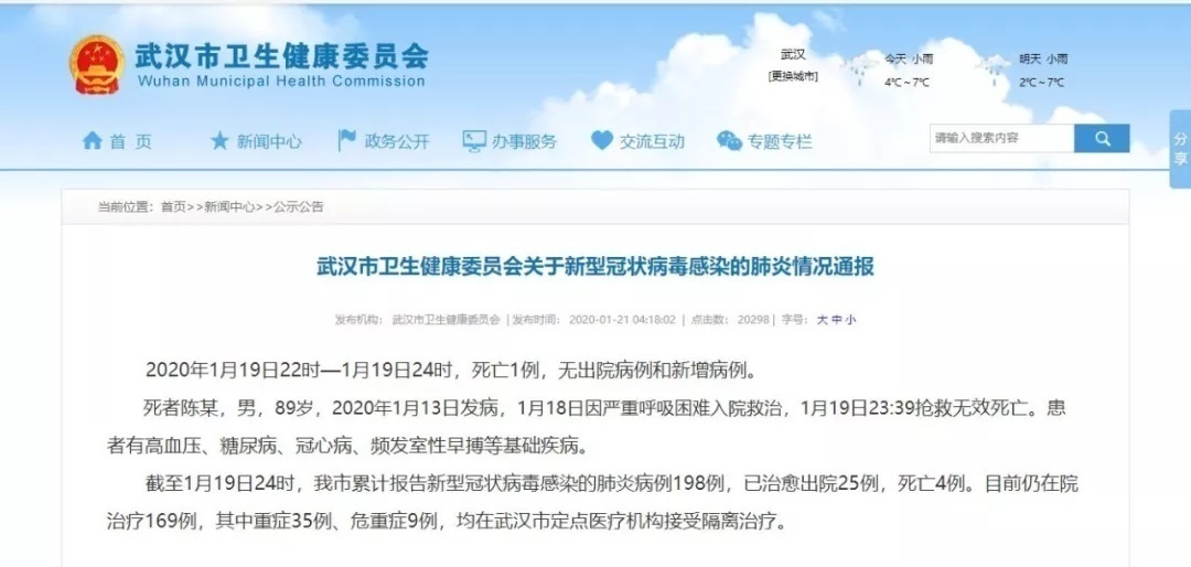 截至1月19日24时,武汉市累计报告新型冠状病毒感染的肺炎病例198例,已治愈出院25例,死亡4例。目前仍在院治疗169例,其中重症35例、危重症9例。