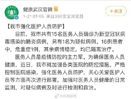 武汉市卫健委21日发布通报:武汉市共有15名医务人员确诊为新型冠状病毒感染的肺炎病例,另有1名为疑似病例。