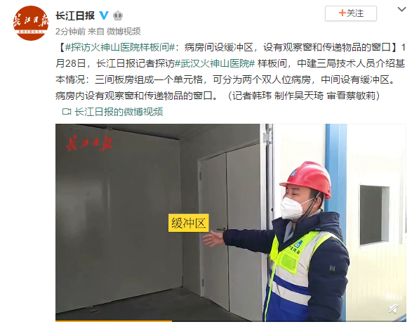 1月28日,长江日报记者探访武汉火神山医院样板间,中建三局技术人员介绍基本情况:三间板房组成一个单元格,可分为两个双人位病房,中间设有缓冲区。病房内设有观察窗和传递物品的窗口。