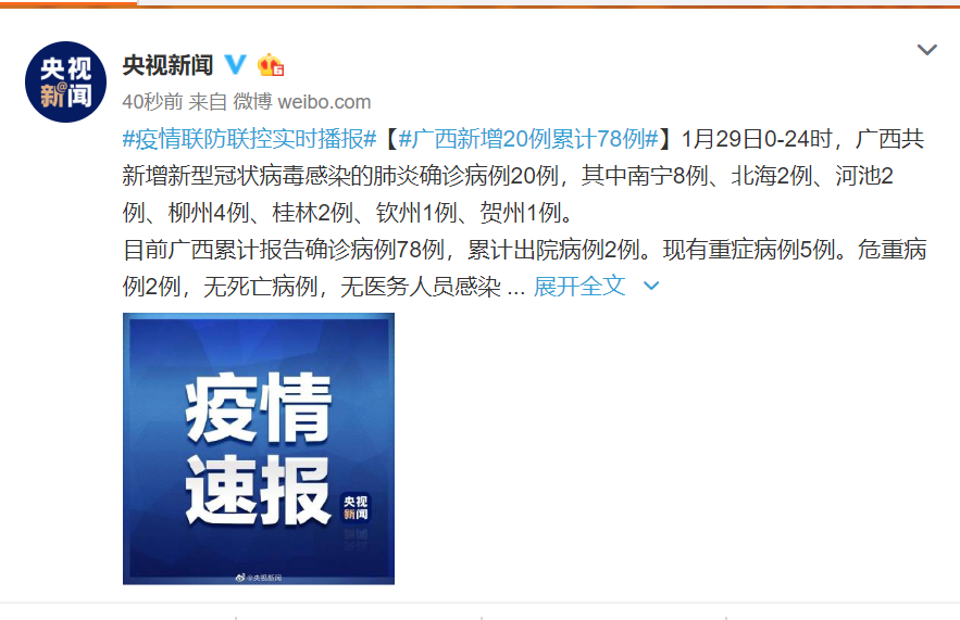 目前广西累计报告确诊病例78例,累计出院病例2例。现有重症病例5例。危重病例2例,无死亡病例,无医务人员感染病例。其中: