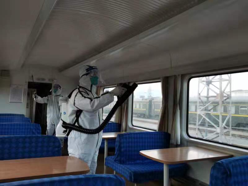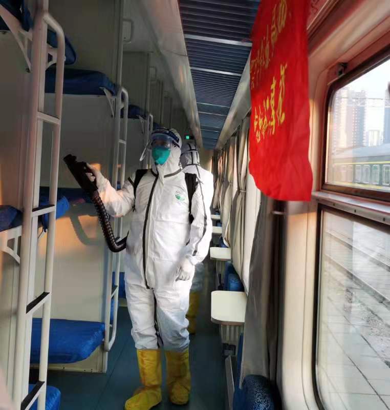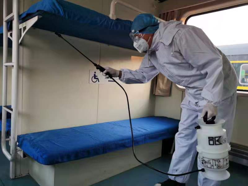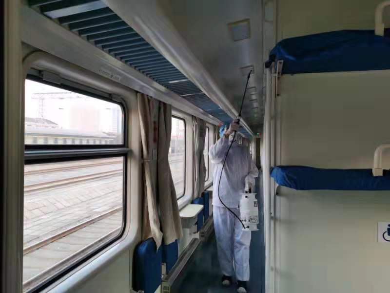 每日,工作人员针对重点车辆喷洒配比好的消毒液,对列车卫生间、把手、行李架、小桌、水龙头等部位及车厢内的空气进行喷洒消毒,保障旅客出行安全。