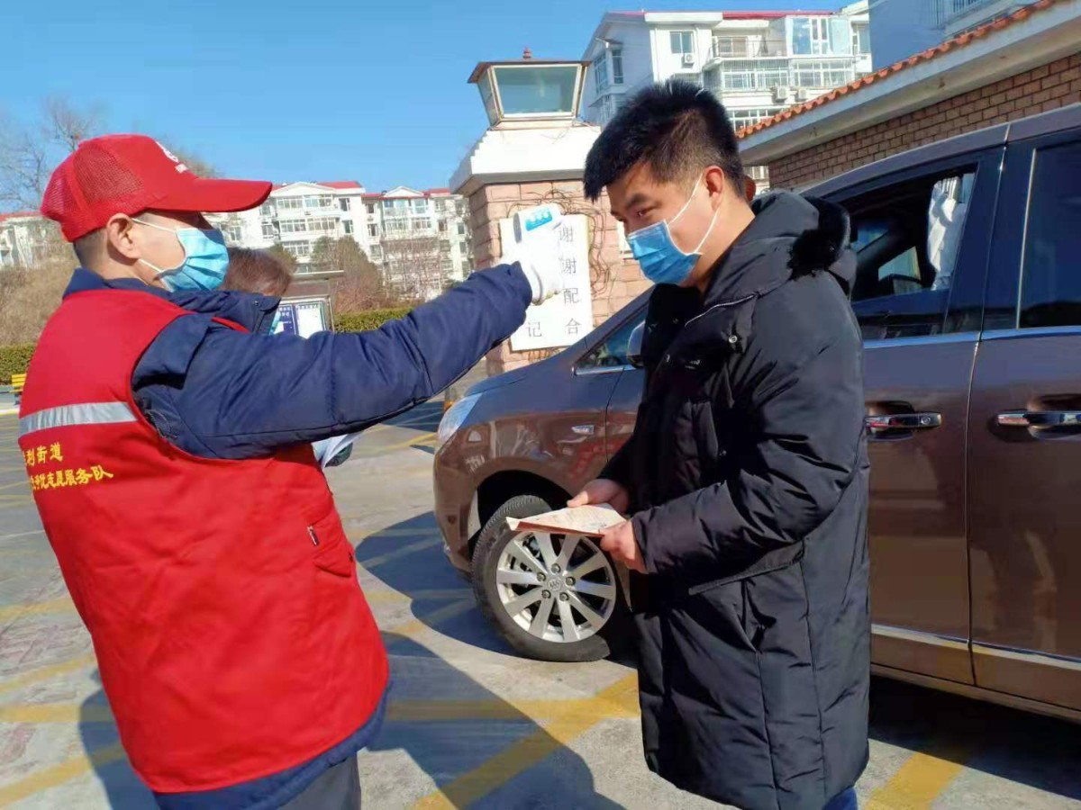 开车的人是外出采购归来的居民,十分配合地完成了体温检测。车上的人均体温正常,车辆才准许进入小区。