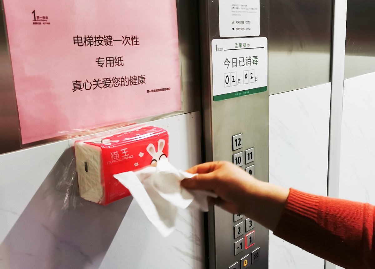2月2日,当代旭辉墅小区的物业人员为辖区的每部高层电梯都配备优质“按钮专用纸”。“按照镇里的要求指导,我们的保洁员每天对小区公共区域进行至少四次的防控消毒,遇特殊情况做到随时消毒。小区封闭式管理,要求外来人员和车辆进行必须做好登记工作。每单元设置宣传栏,张贴疫情防控知识,业主们都特别配合,欢迎大家给我们多提宝贵意见,我们把服务工作做好,和居民们一起防控疫情守平安。”工作人员宋显凤说。