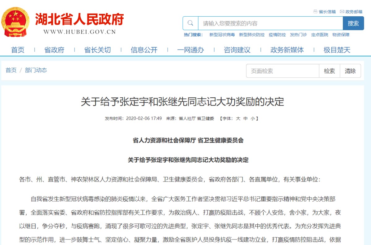自我省发生新型冠状病毒感染的肺炎疫情以来,全省广大医务工作者坚决贯彻习近平总书记重要指示精神和党中央决策部署,全面落实省委、省政府和省防控指挥部有关工作要求,为救治病人、打赢防疫阻击战,不顾个人安危,舍小家,为大家,夜以继日,争分夺秒,与疫病赛跑,涌现了很多可歌可泣的先进典型,张定宇、张继先同志是其中的优秀代表。为充分发挥先进典型的示范作用,进一步鼓舞士气、坚定信心、凝聚力量,激励全省医护人员投身抗疫一线建功立业,打赢疫情防控阻击战,依据《事业单位工作人员奖励规定》和鄂防指发〔2020〕7号文件精神,省人力资源和社会保障厅、省卫生健康委员会决定给予张定宇、张继先同志记大功奖励。