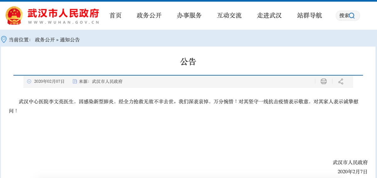 武汉中心医院李文亮医生,因感染新型肺炎,经全力抢救无效不幸去世。我们深表哀悼,万分惋惜!对其坚守一线抗击疫情表示敬意,对其家人表示诚挚慰问!