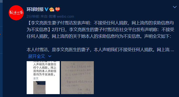 2月7日,李文亮医生的妻子付雪洁在社交平台发布声明称,不接受任何个人捐款,网传关于她本人的求助信息均为不实信息。