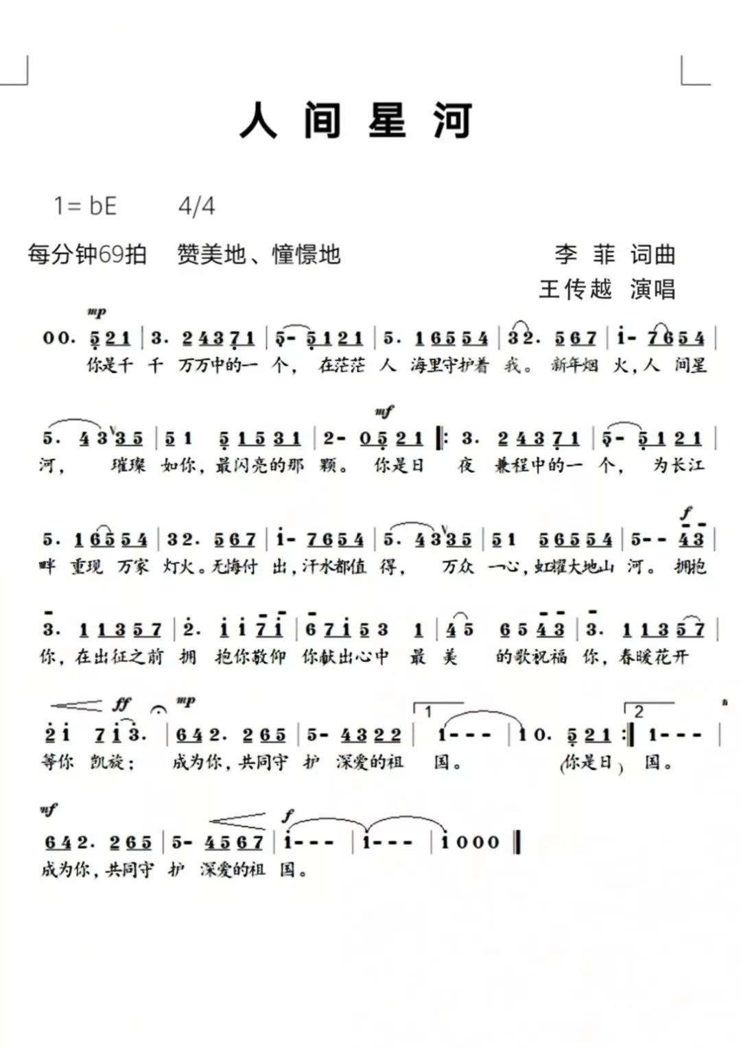 《人间星河》由知名青年作曲家李菲(任职于中国文联音乐艺术中心,兼任中共中央直属机关青年联合会第五届文化艺术界别秘书长)作词、作曲并担纲制作人,特邀著名男高音歌唱家、中央音乐学院副教授王传越演唱,以此表达向奋战在疫情防控一线所有勇士们的感谢与敬意,表达对江城武汉和疫区人民的祝愿,表达对祖国的深厚情感。