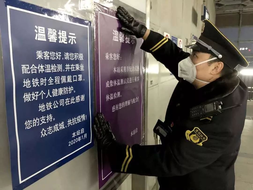 地铁员工在出入站口张贴体温检测提示。