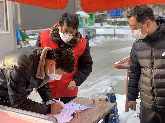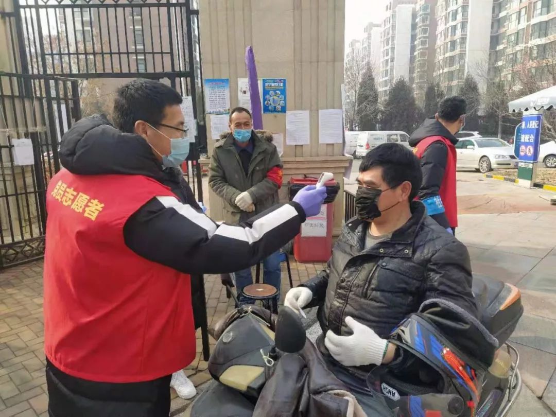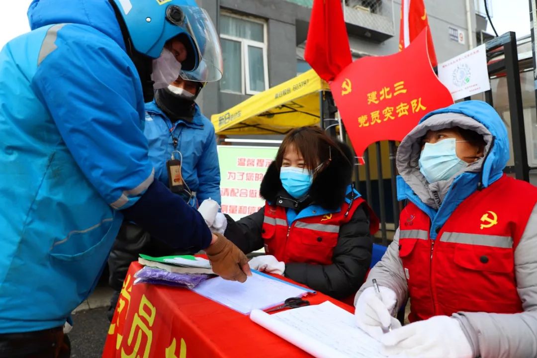 顺义区胜利街道建北三社区党员突击队进行出入社区测量体温登记工作。