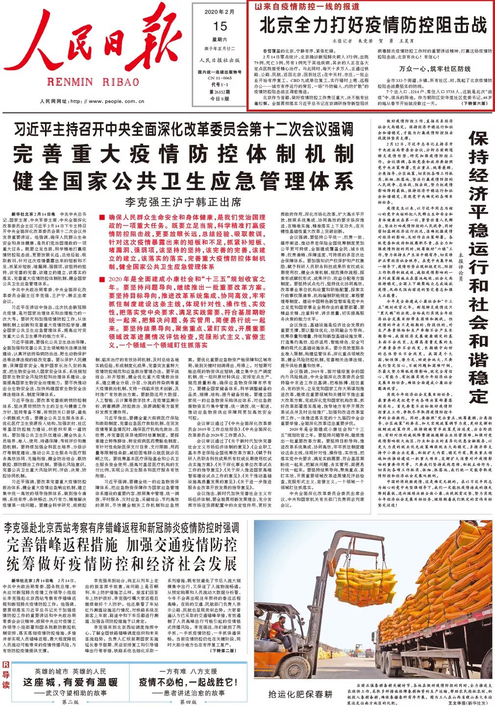 2月15日出版的《人民日报》,在一版以《北京全力打好疫情防控狙击战》为题刊发了来自疫情防控一线的报道。