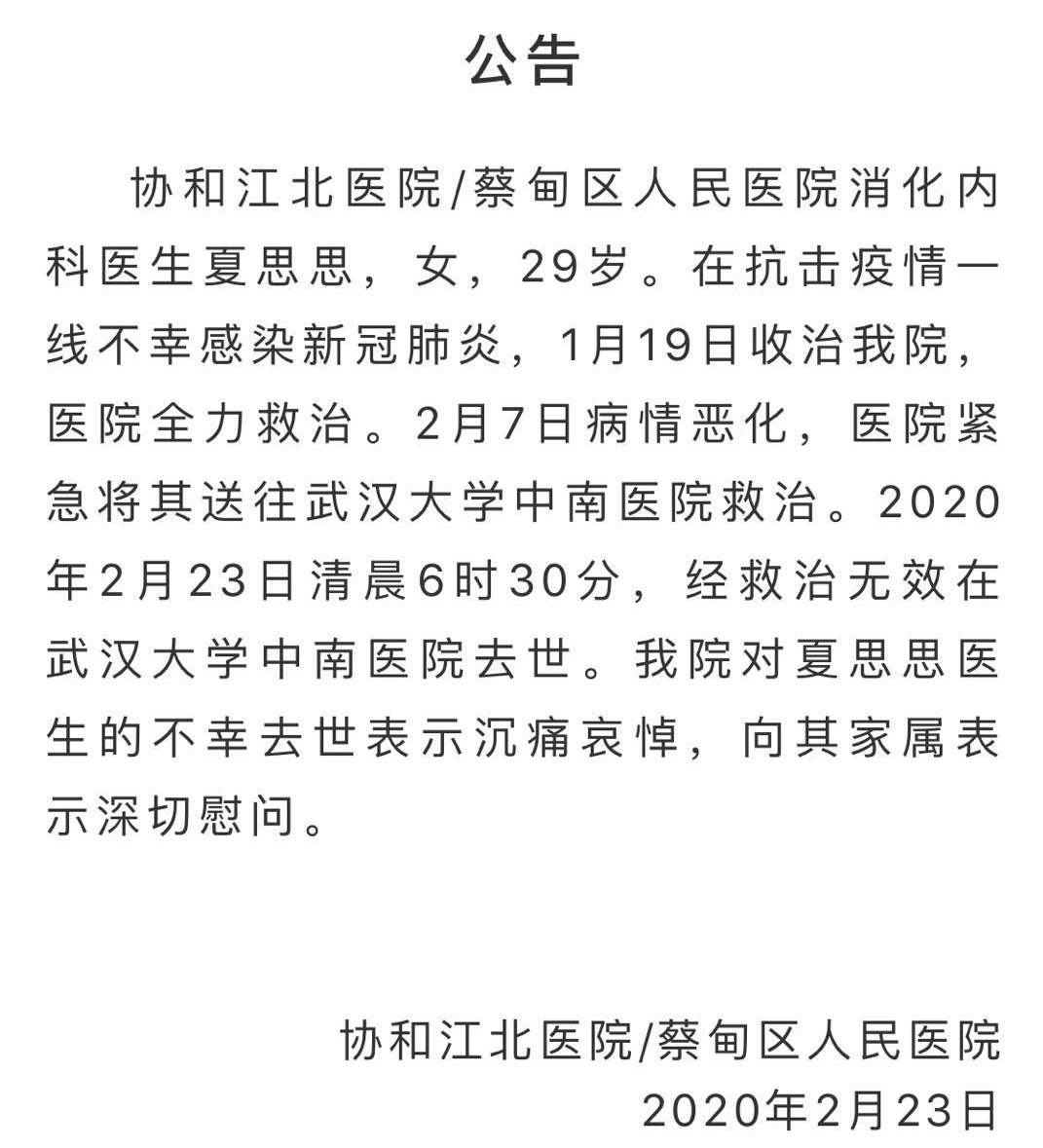协和江北医院(蔡甸区人民医院)消化内科年轻女医生夏思思因感染新冠肺炎,经抢救无效,于23日清晨殉职,年仅29岁。