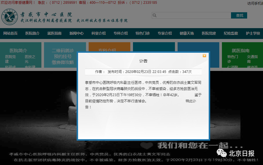 昨晚,湖北孝感市中心医院官网发布讣告: