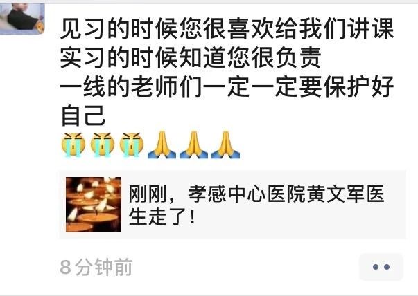 孝感市中心医院呼吸内科副主任医师,中共党员,优秀的白衣战士黄文军同志,在抗击新型冠状病毒肺炎的战役中,不幸被感染,经多方抢救医治无效,于2020年2月23日下午19时30分,不幸牺牲!卒年42岁。
