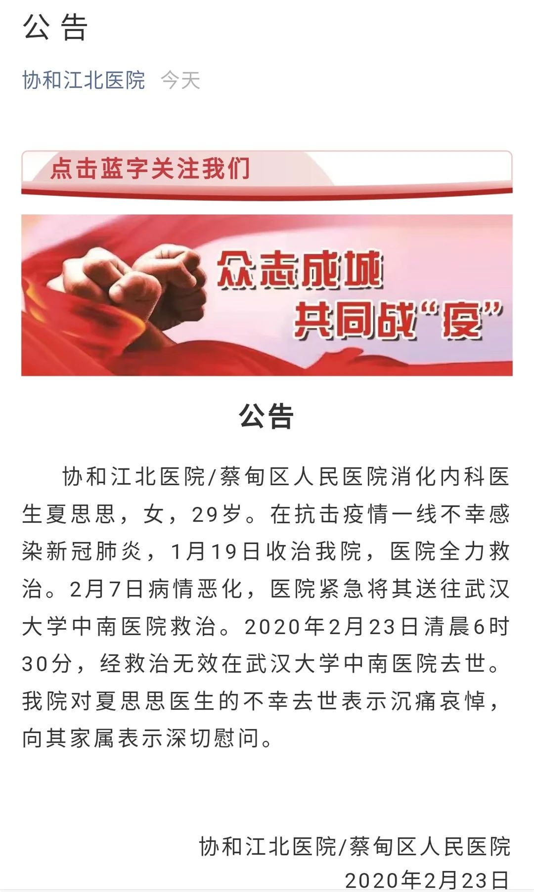 23日下午2时许,协和江北医院发布公告,哀悼夏思思医生。公告称,协和江北医院/蔡甸区人民医院消化内科医生夏思思,女,29岁。因在抗击疫情一线不幸感染新冠肺炎,于2月23日清晨6时30分在武汉大学中南医院去世。