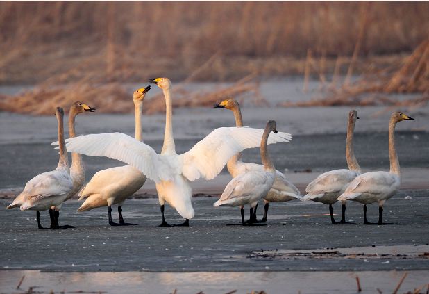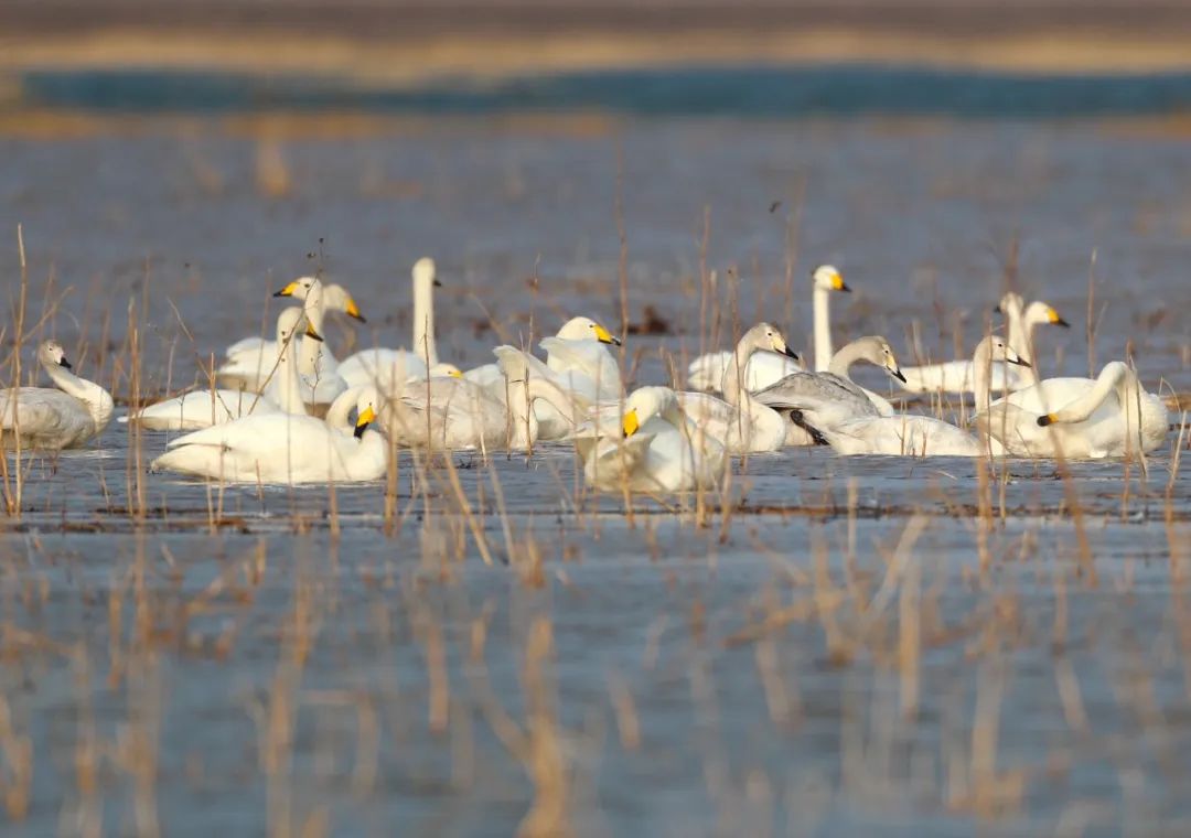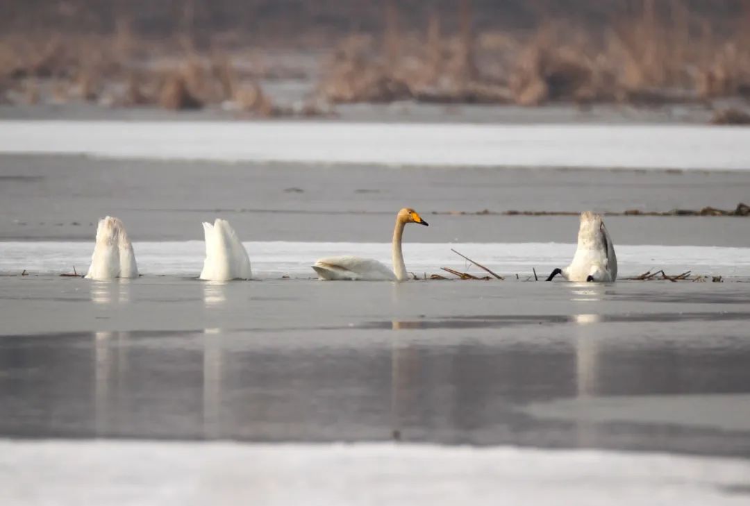 “在冰面融化速度比较快的地方,形成了大面积的水域,天鹅等鸟儿都会聚集过来觅食。”黑豹野生动物保护站站长李理介绍。天鹅们降落后,第一件事是洗澡,梳理羽毛,先以家庭为单位进行整理,然后才会合到大群当中。