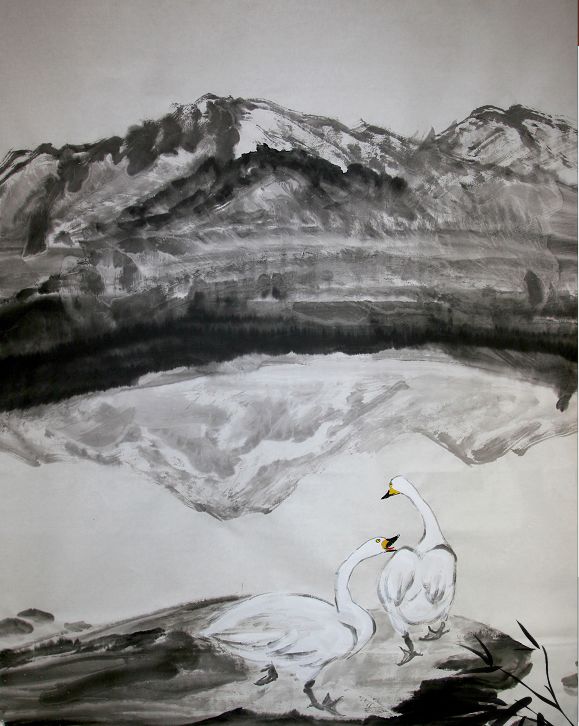 “由于新冠肺炎疫情,水库和周边都没有什么人,库区前两天有违规冰钓的人也被清理了,农地里也没有开始整理土地,路上的大卡车也很少,村庄和村庄之间都在隔离。”李理介绍,没有遛弯的、没有冰钓的、也没有开始春耕,官厅水库还给了候鸟,成为动物的天堂。为此,身为画家的李理,还创作了一幅水墨画《海陀峰下天鹅湖》。