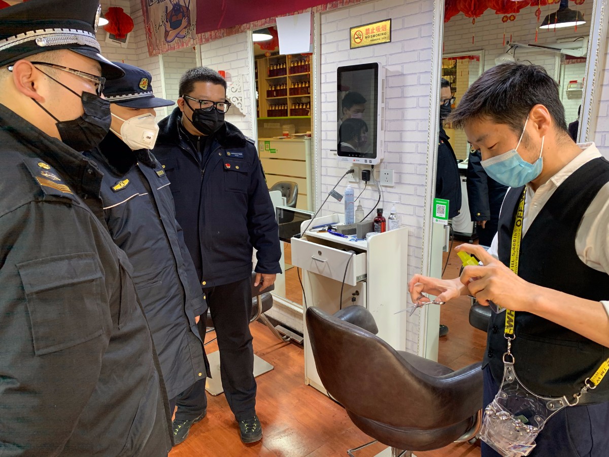 《疫情期间美容美发行业指引》列出了12项内容,执法人员“对单”逐一检查。其中包括:店内是否保持空气流通,是否及时消毒,是否采取预约制等。在检查的8家理发店中,发现一家理发店没有配备体温枪,执法人员当场责令其停业整顿。