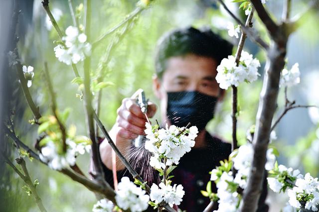 大棚樱桃陆续进入盛花期,工作人员正在给花喷洒营养液。