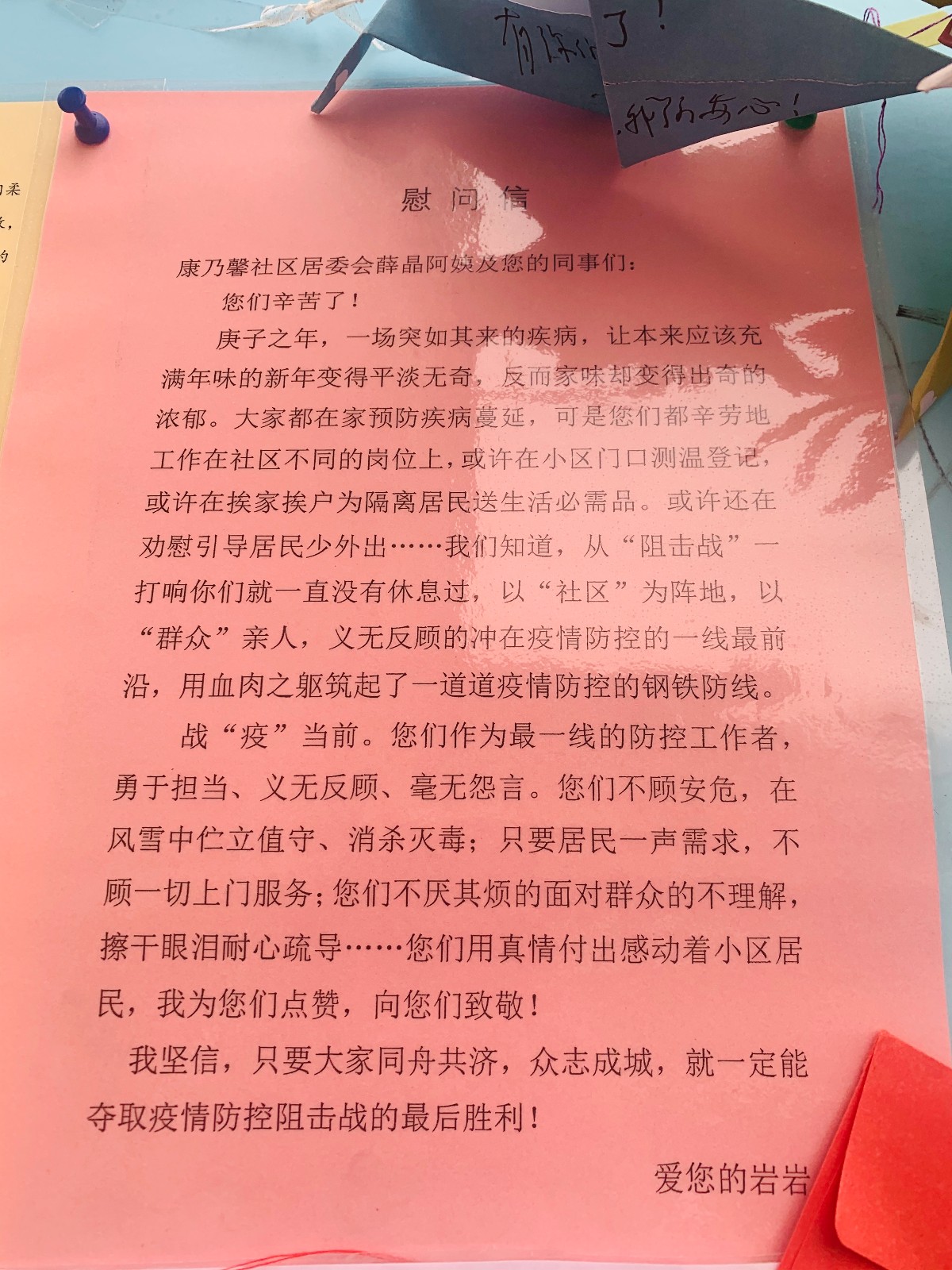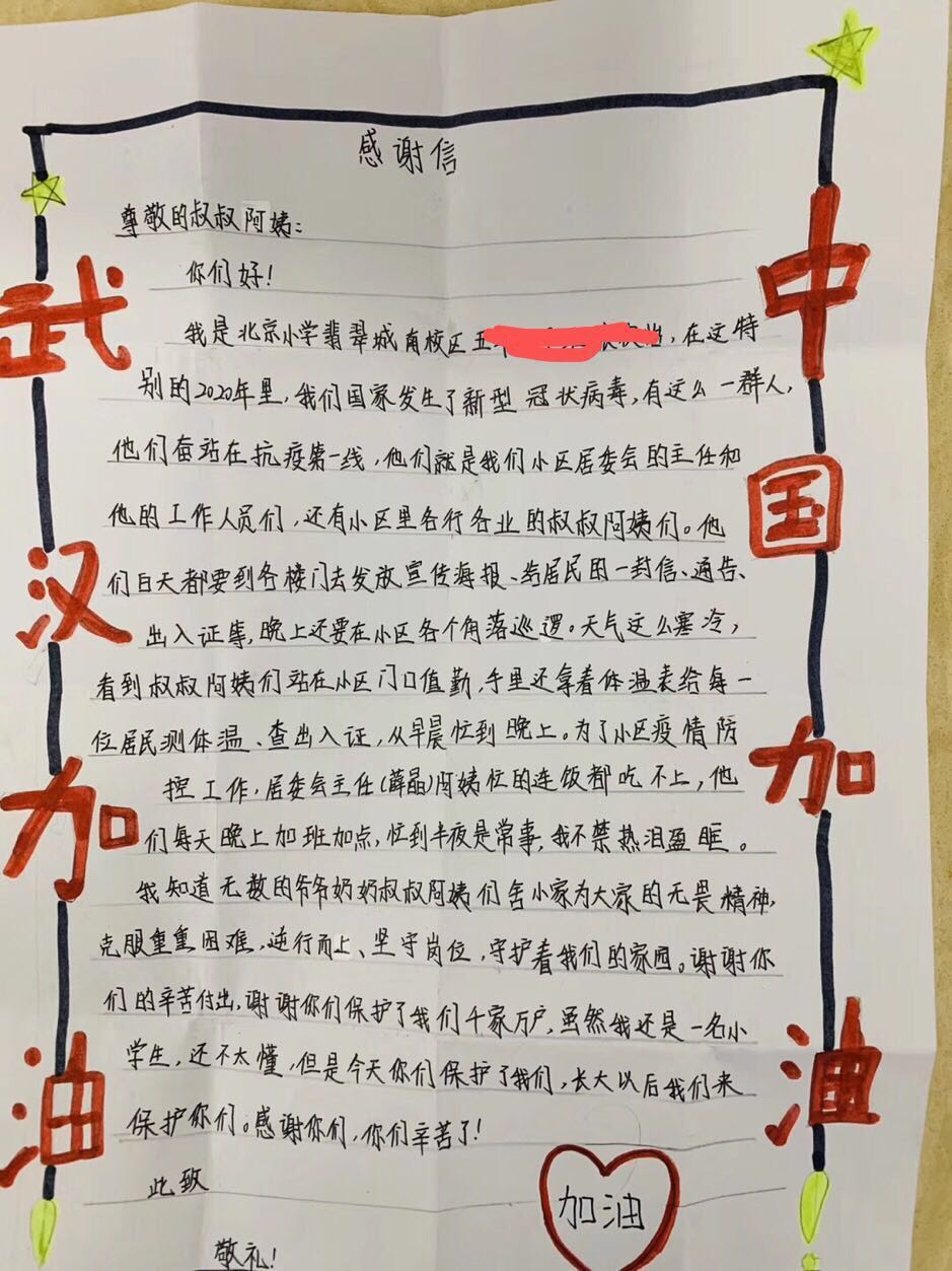 “写在白纸上太简单了,我就在旁边写上了‘中国加油’‘武汉加油’。”写完信,张欣怡仔细地用红色的信封装好,贴上贴纸,送到了社区。