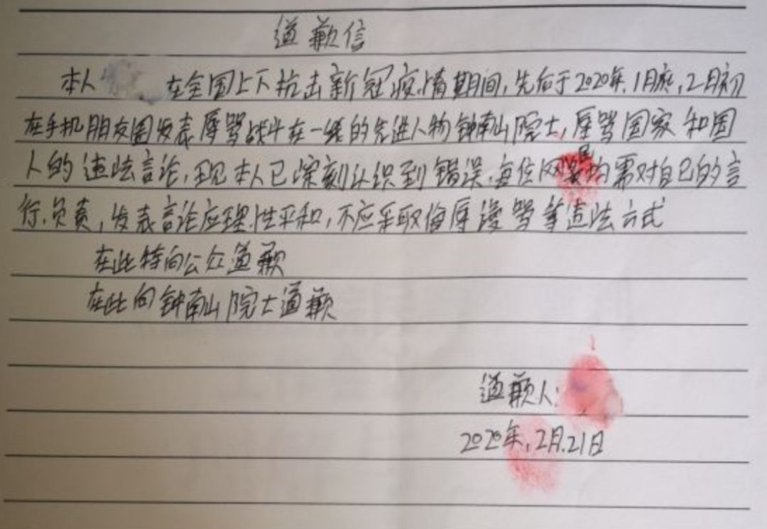 据微信公众号“中山检察”消息,近日一男子在微信朋友圈辱骂钟南山院士,被拘留15天。经训诫教育后,他亲笔书写了道歉信,愿主动在媒体上公开道歉,消除不良影响。