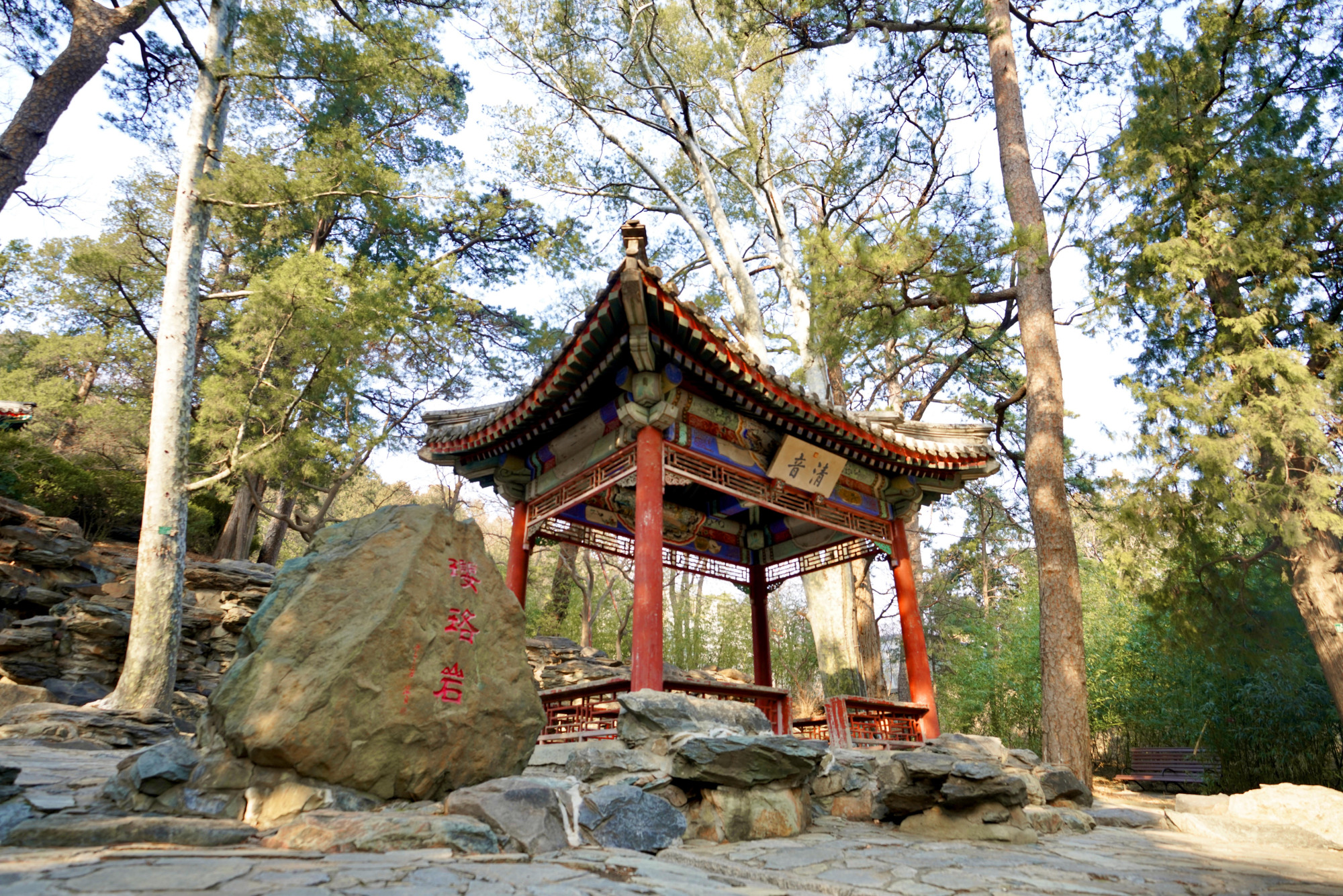 璎珞岩是静宜园二十八景之一,始建于明代,由人工叠石成假山型,水柱顺叠石而下,水滴溅到石上、水潭中犹如颗颗璎珞散开,顾名璎珞岩。景区内建有“清音”亭和“绿筠深处”敞厅。璎珞岩地处林间,清幽雅致,是听泉、观景、静心、洗尘的最佳之地。《日下旧闻考》里称这里:“亭之胜以耳受,岩之胜以目谋,澡濯神明,斯为最矣”。