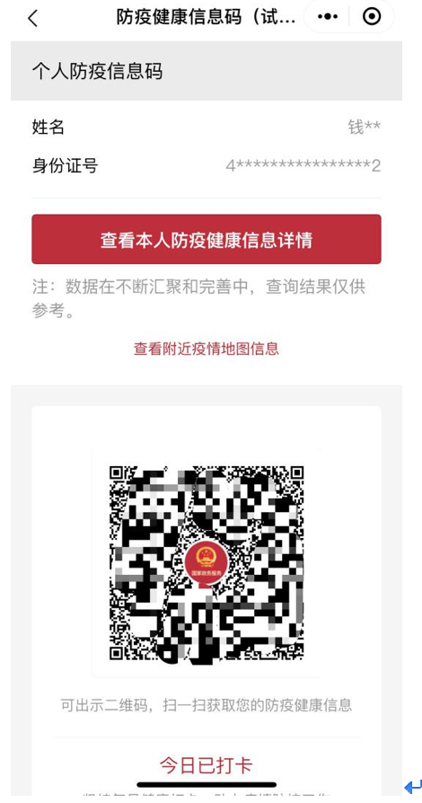 值得一提的是,依托国家政务服务平台统一身份认证系统、统一电子证照系统,利用汇聚的卫生健康、民航、铁路等方面数据。公众在实名认证后,还可以一键查看本人的防疫健康相关信息详情,如是否为新冠肺炎确诊或疑似患者、是否为同行密切接触人员。