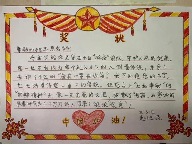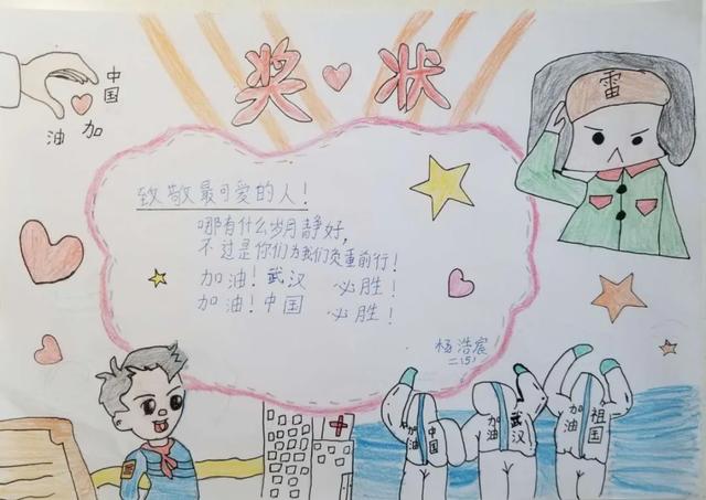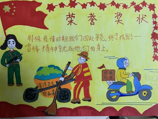 而今年,在这个“特殊时期”,学校组织开展了特别的学雷锋主题活动,号召孩子们在平安居家时充分发挥自己的想象力与创造力,为心中的战疫“雷锋”设计制作一张创意奖状。