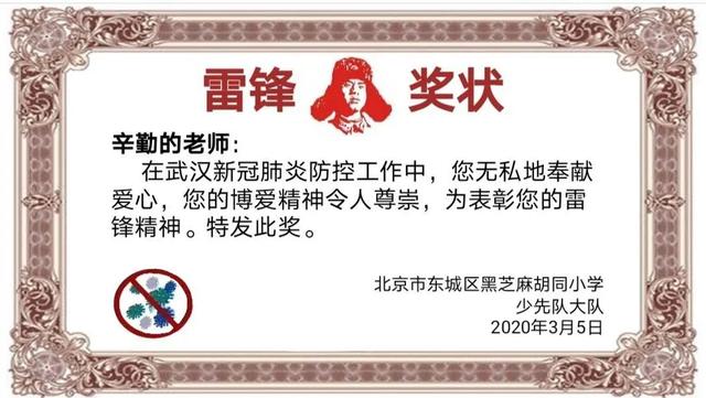 今天是第57个学雷锋纪念日,近日,黑芝麻胡同小学优质教育资源带组织开展了以“寻找战疫‘雷锋’ 绘制创意奖状”为主题的线上活动,学生们拿起手中的画笔为心中的战疫“雷锋”设计创意奖状,以这种特殊的方式学习雷锋精神。