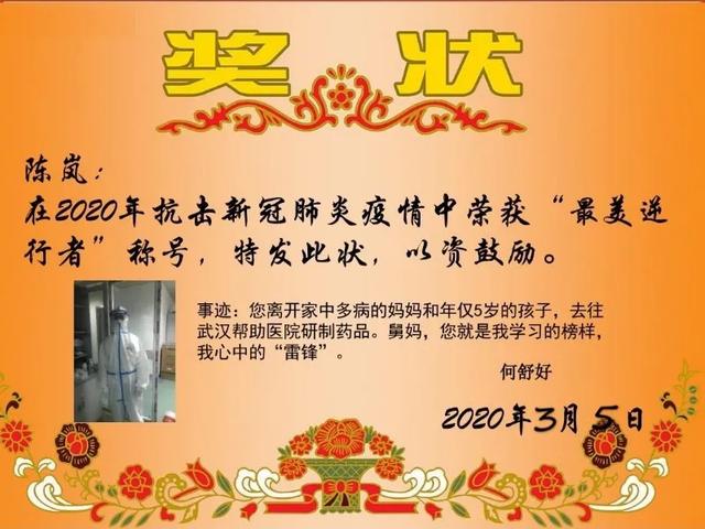 您离开家中多病的妈妈和年仅5岁的孩子,去往武汉帮助医院研制药品。舅妈,您就是我学习的榜样,我心中的“雷锋”。