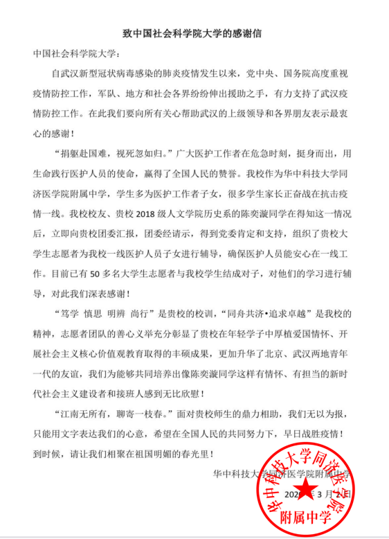 同济附中给社科大发来感谢信