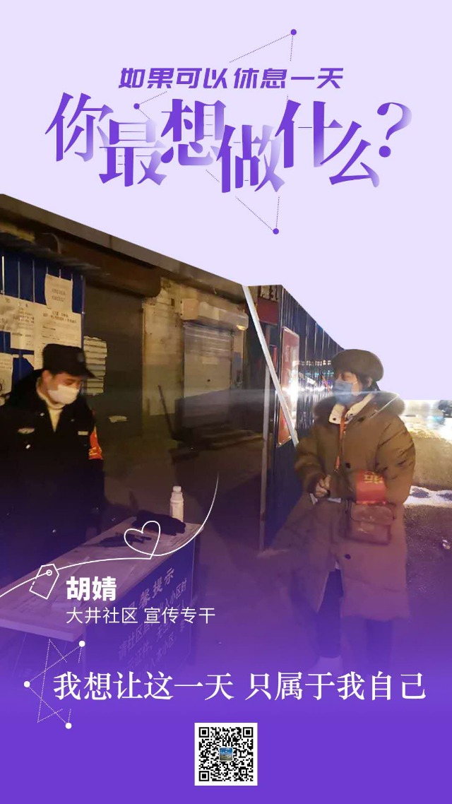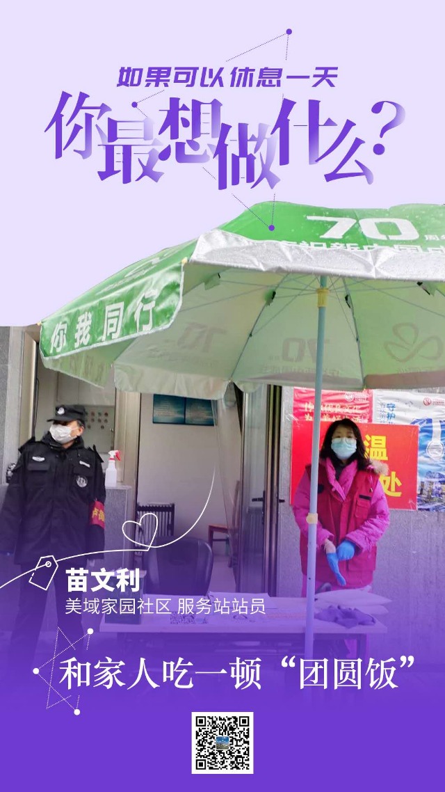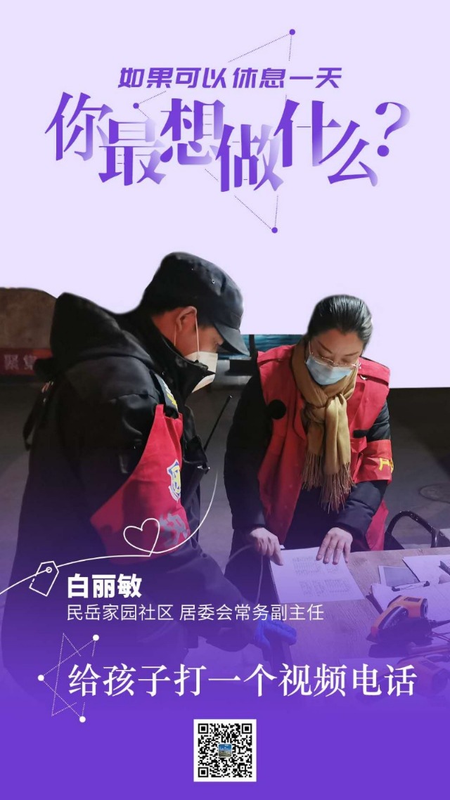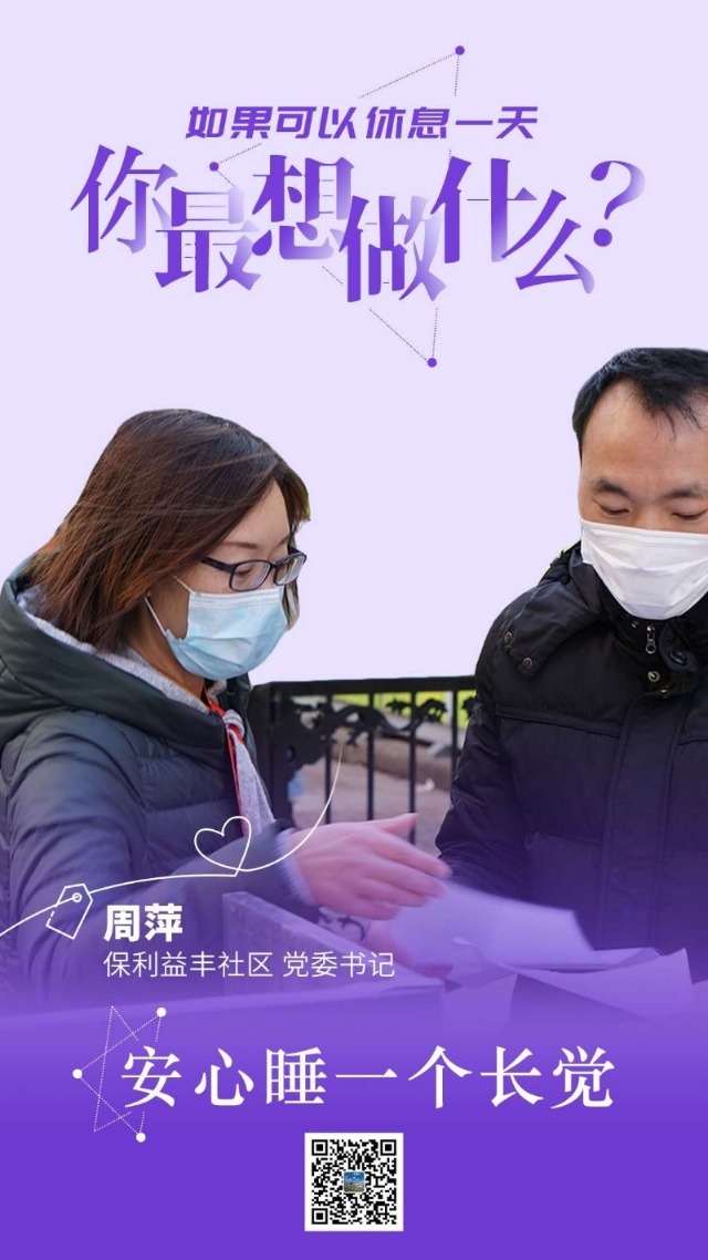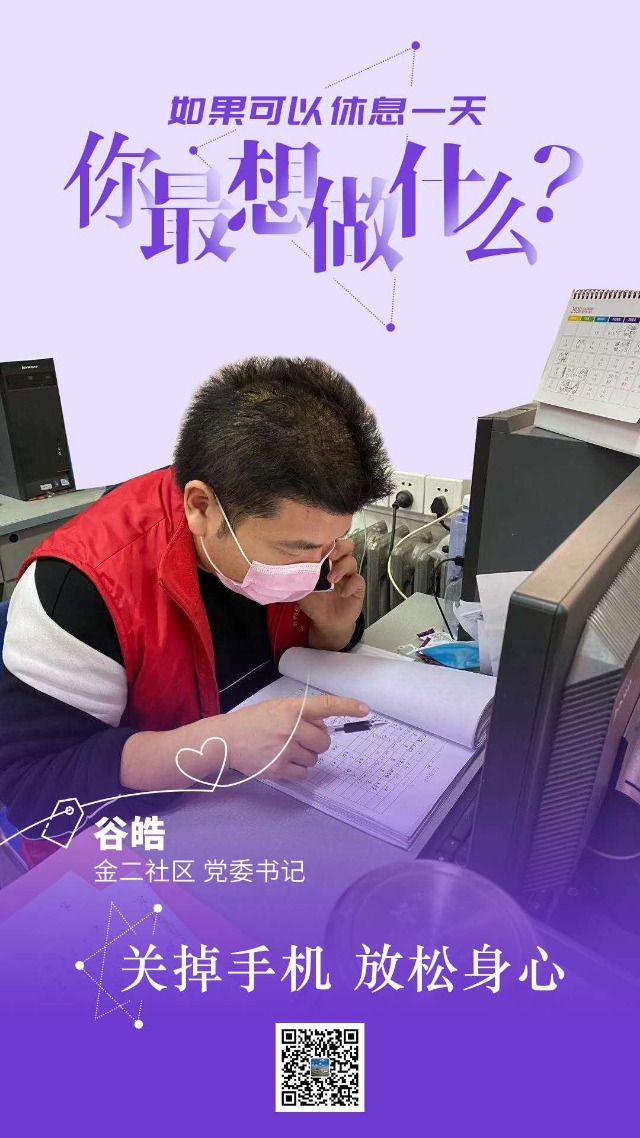 如果休息一天,我想把手机关机,安心地睡一个长觉。当然这只是愿望,社区事情很多,防疫担子很重,即便休息,也要保持时刻与外界的联络畅通。