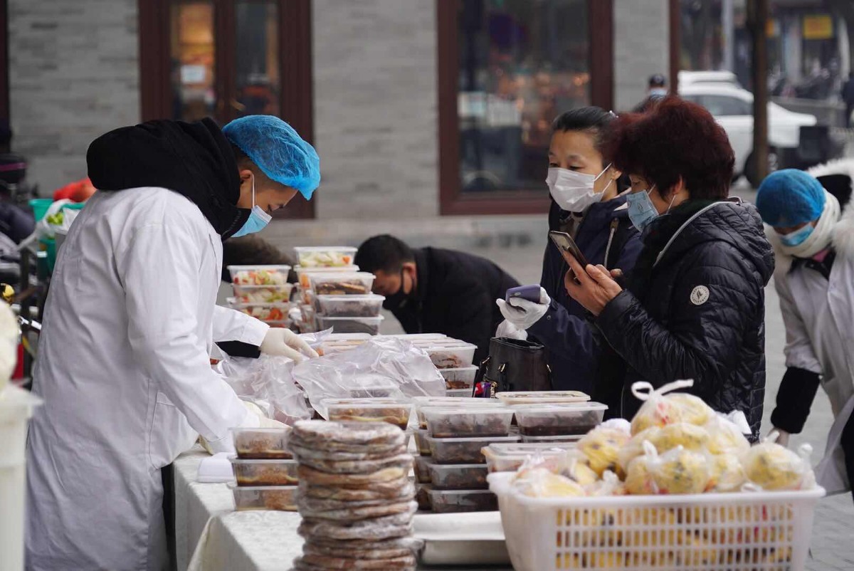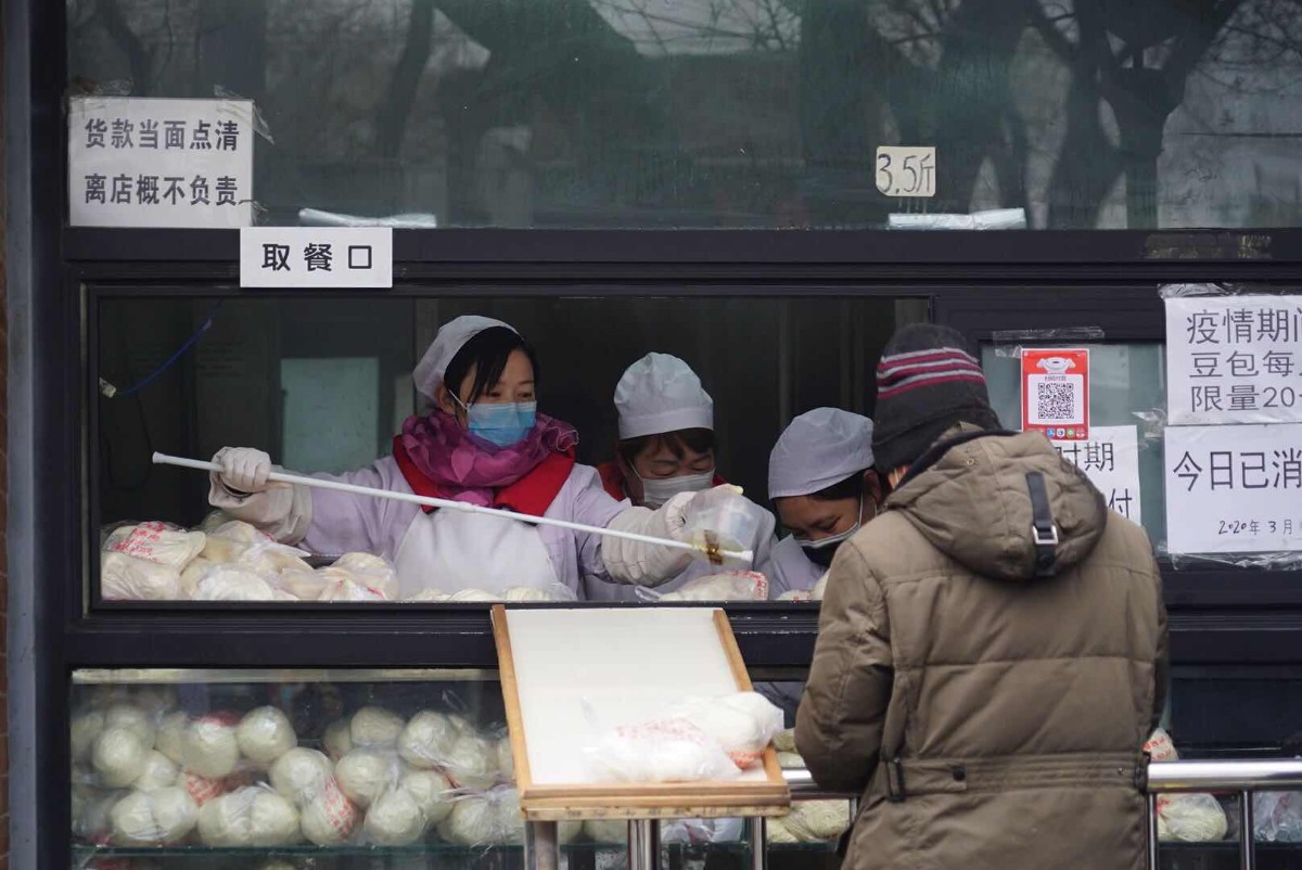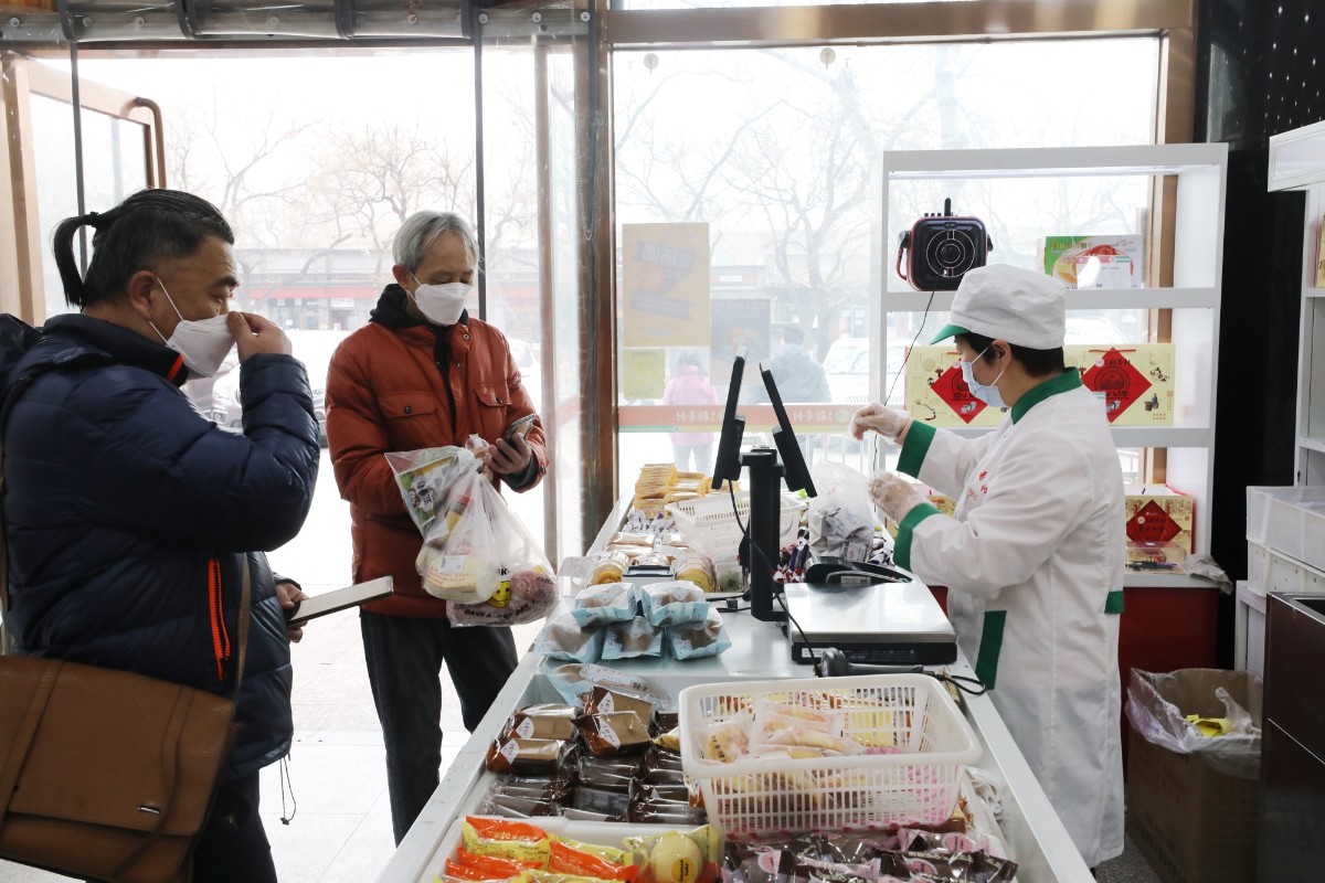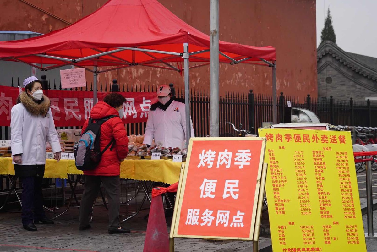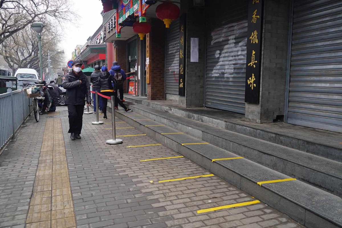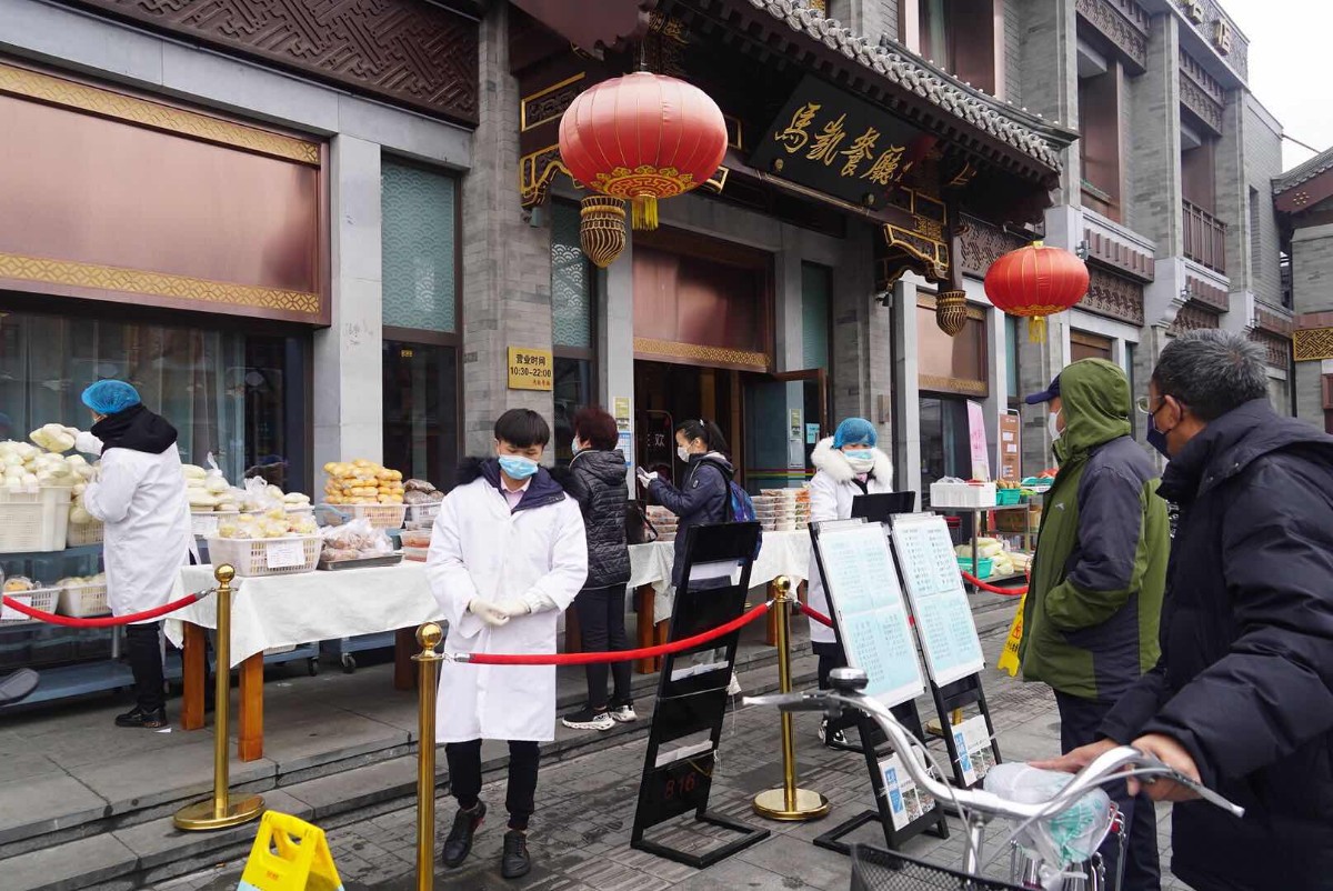 鼓楼大街周边老字号“马凯餐厅”、“烤肉季”等纷纷推出便民服务点外设销售摊位,并设立一米线、隔离区域、单向倒流等措施,满足顾客需求的同时引导顾客保持距离、有序购买。网红的鼓楼馒头店前,商业贴出一米线位置,顾客自觉拉大排队间隔,空出安全距离。排队保持一定距离渐成市民自觉行为。